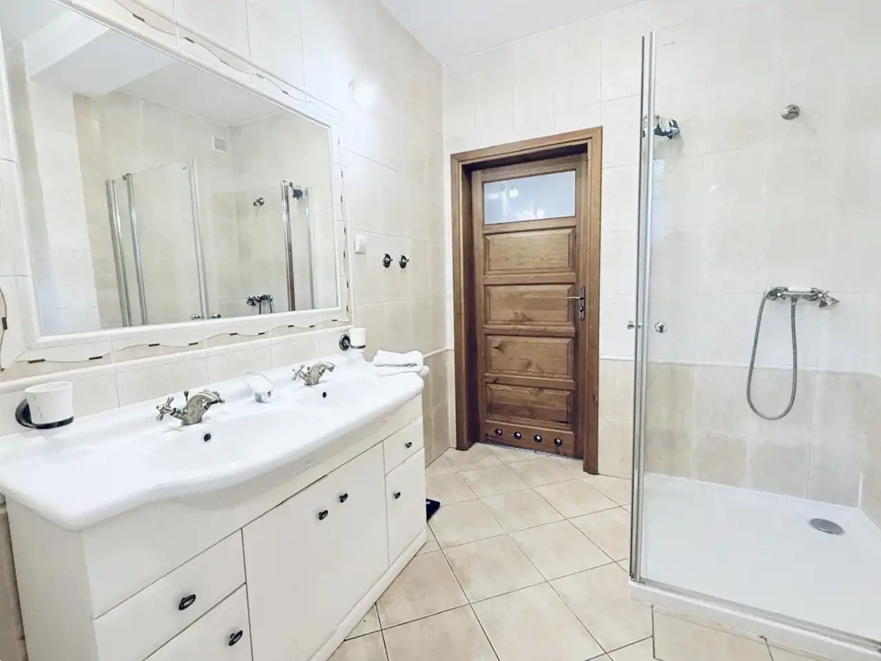 - łazienkę z kabiną prysznicową i podwójną umywalką,
