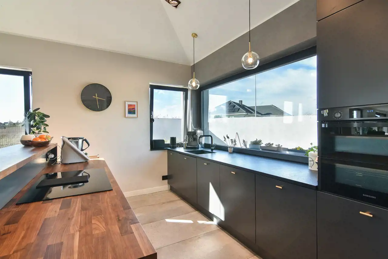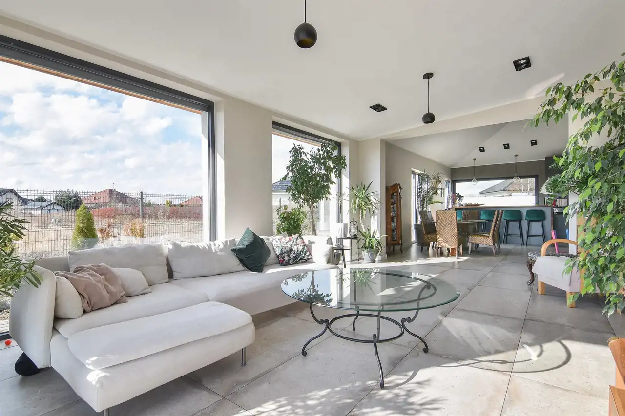 Dom powstał z wysokiej jakości materiałów, na dużej działce, w zabudowie bliźniaczej i został tak zaprojektowany, że zapewnia właścicielom przestrzeń i swobodę. Ma duże okna z widokiem na pięknie zagospodarowany ogród i zieleń za ogrodzeniem. Z pewnością zaspokoi potrzeby wymagających klientów.