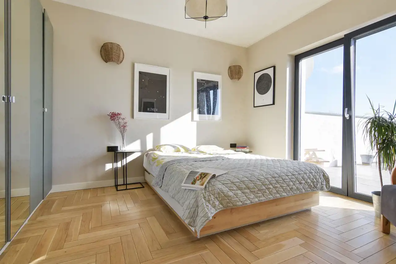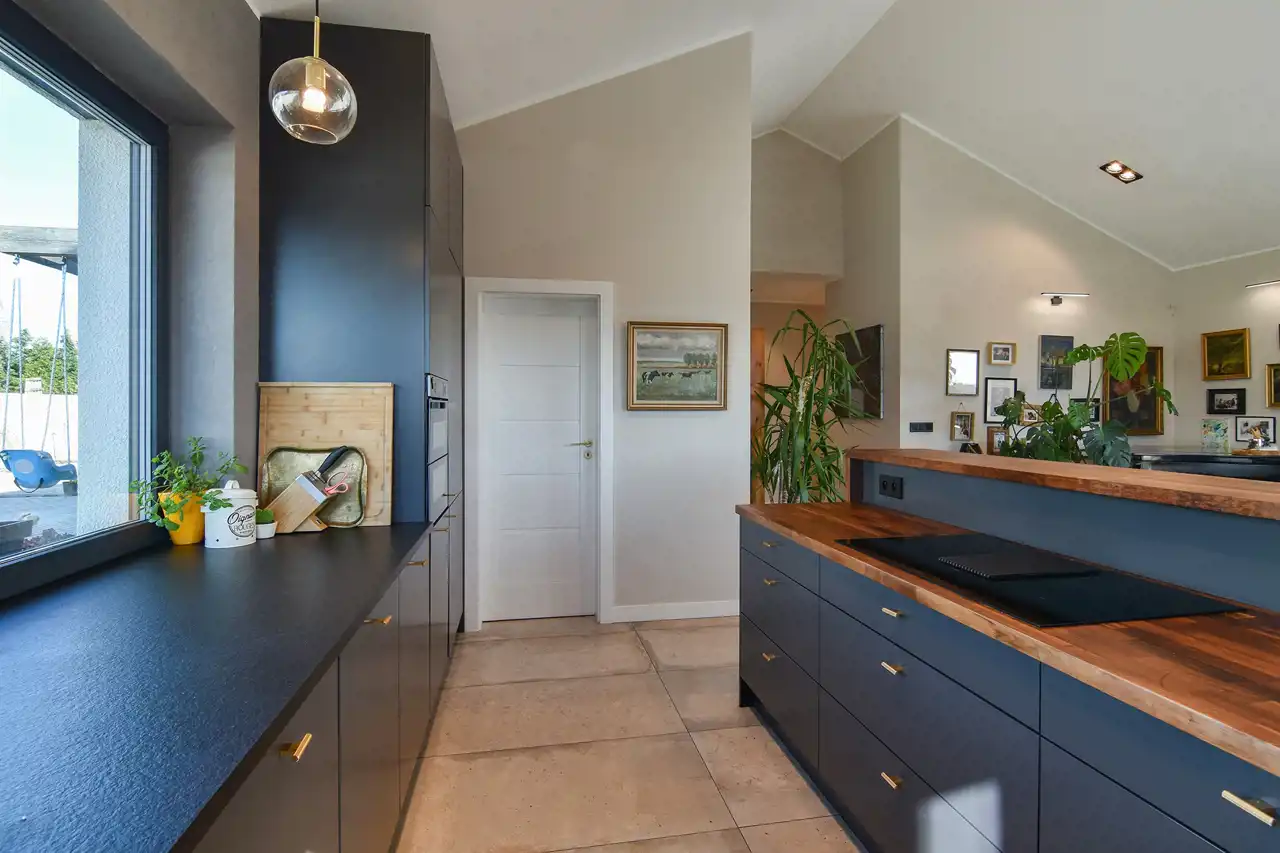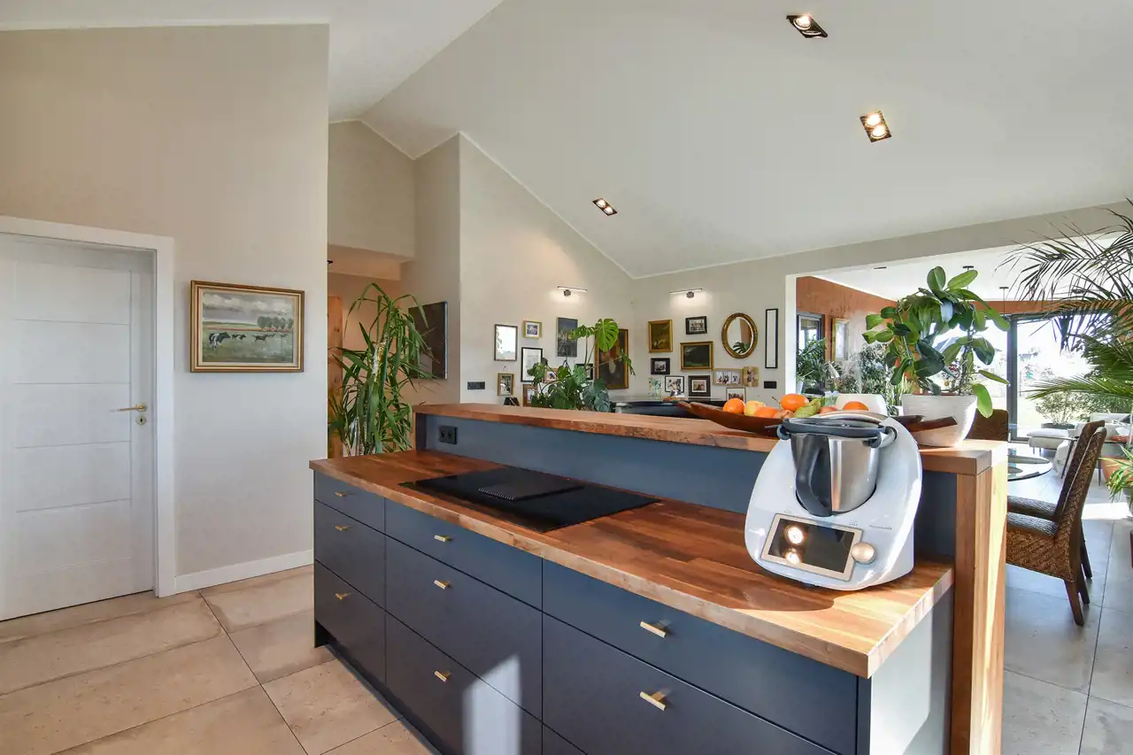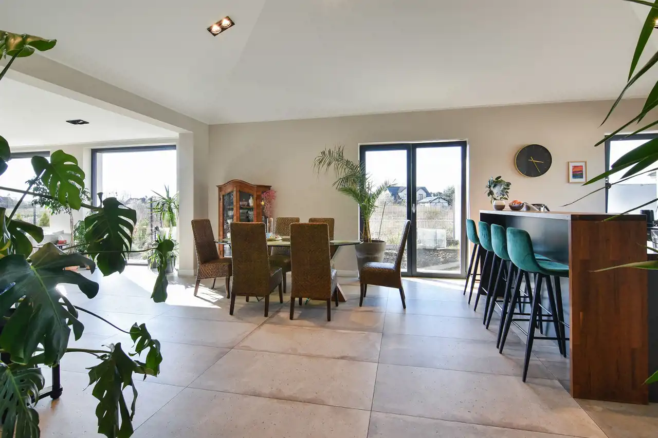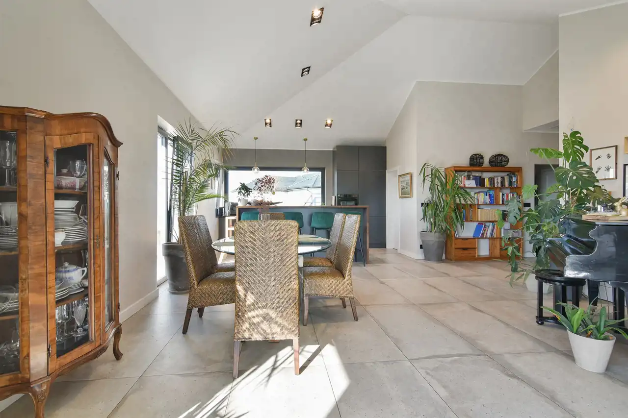 Salon jest połączony z jadalnią i otwartą kuchnią, nad którymi podwyższono sufit, by otworzyć przestrzeń. Całość została nowocześnie zaaranżowana i starannie wykończona.