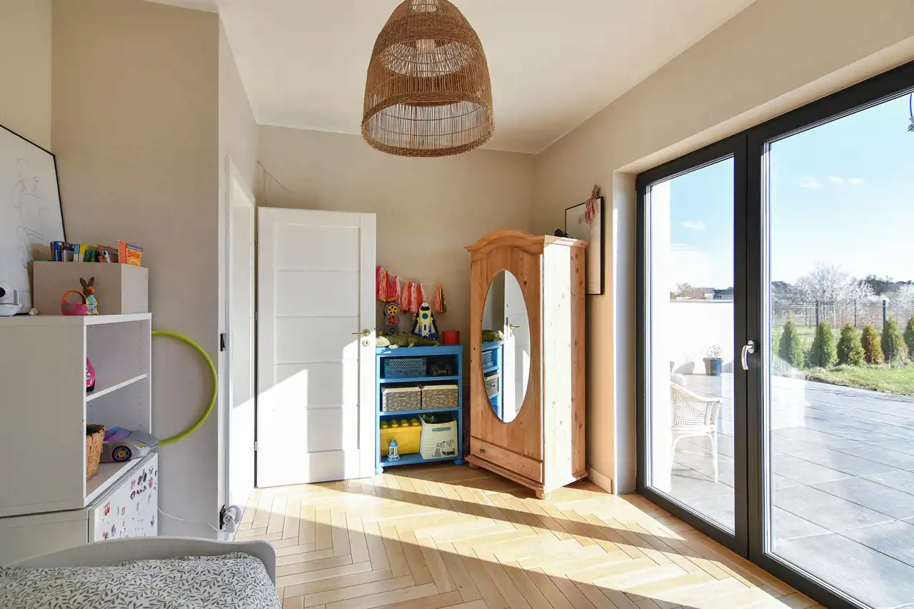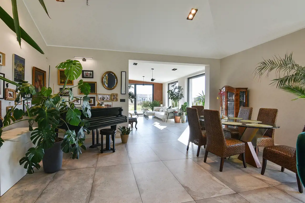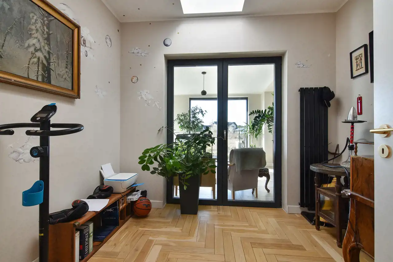 Jednak największym walorem tego pięknego domu jest bardzo duży taras otwarty na południowy zachód i zieloną przestrzeń. Działki sąsiadujące od tej strony z posesją nie są przeznaczone do zabudowy.