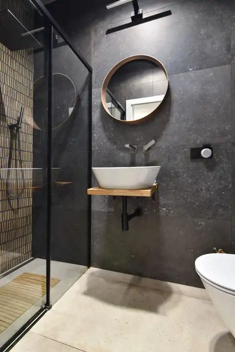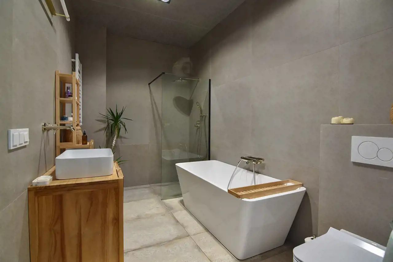 Dwie wygodne sypialnie znajdują się w tylnej części domu, prowadzi do nich korytarz, z którego wchodzi się po kolei do dwóch łazienek, jednej z prysznicem, drugiej z wanną oraz prysznicem. Dodatkowo, powstał gabinet z oknem na przeszkloną część salonu.