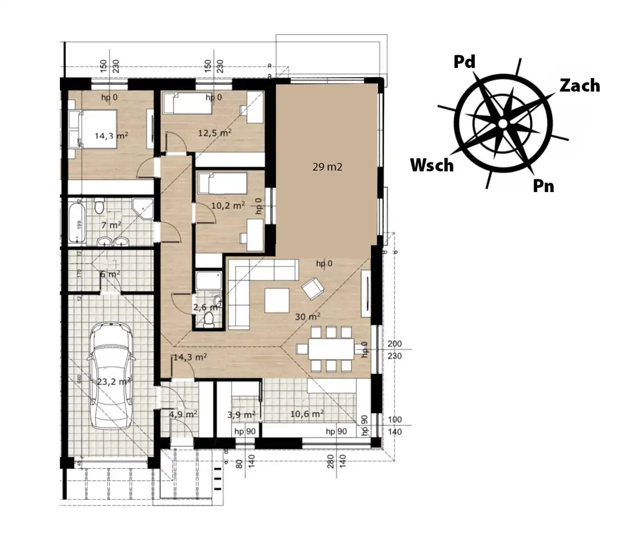 Obok kuchni znajduje się zawsze ceniona przez panie spiżarnia, a po drugiej stronie korytarza wejście do przestronnego garażu. Przed garażem jest miejsce na zaparkowanie jeszcze dwóch samochodów.