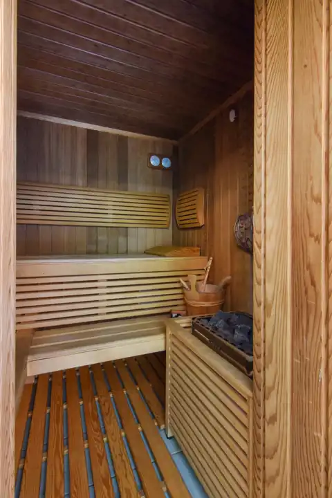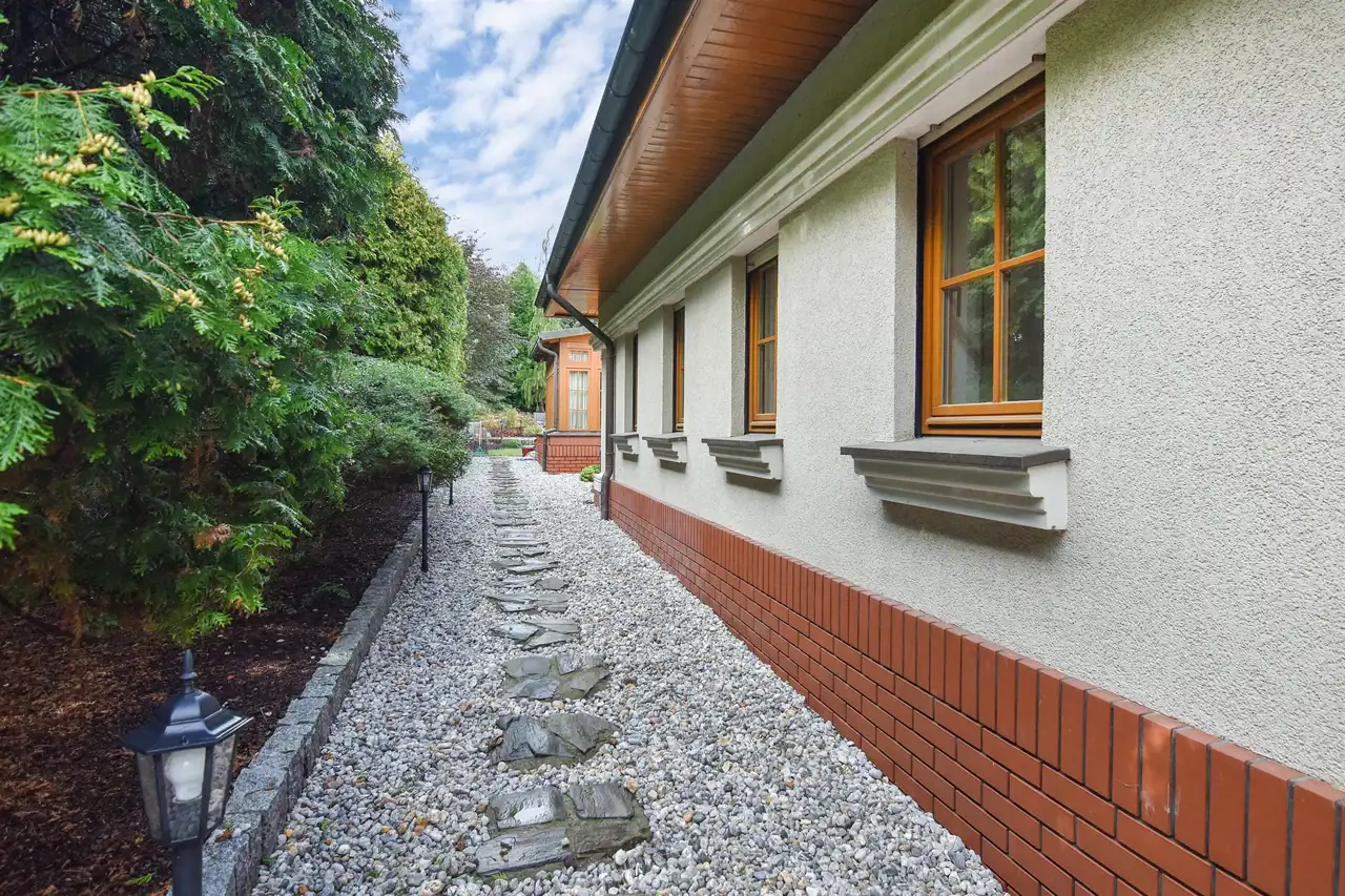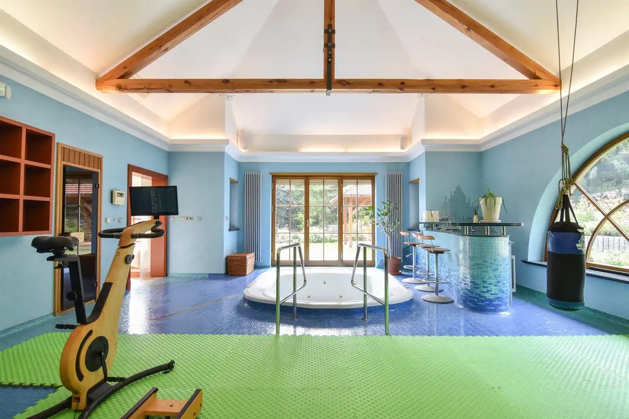 Wspomniana strefa wellness wyposażona w duże jacuzzi oraz saunę i łazienkę, posiada też bezpośrednie wyjście na ogród, w sąsiedztwo, usytuowanej nad oczkiem wodnym, otwartej altany. To miłe miejsce spotkań letnich, zapewniające schronienie przed słonecznym skwarem. W ogrodzie znajduje się też piaszczysta miniplaża - wspaniałe miejsce zabawy dla najmłodszych.