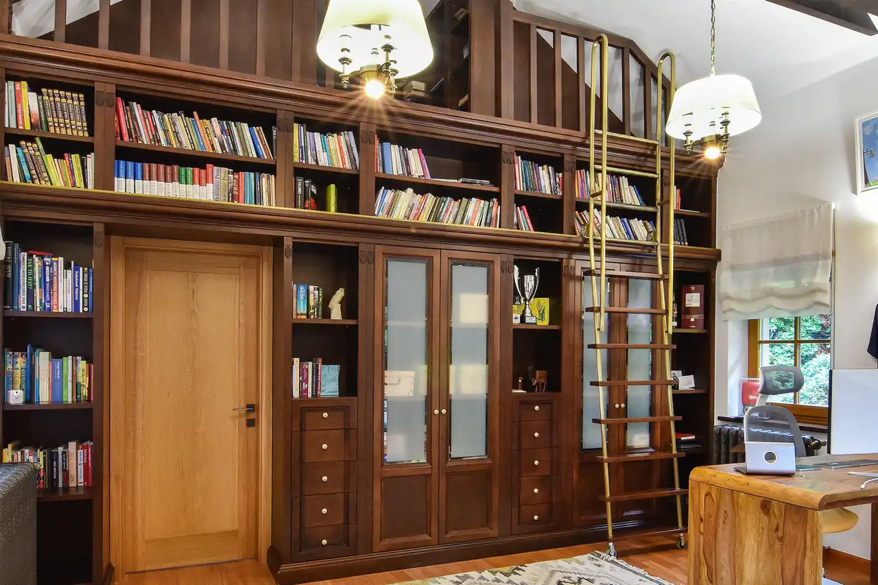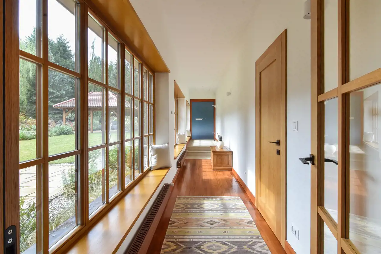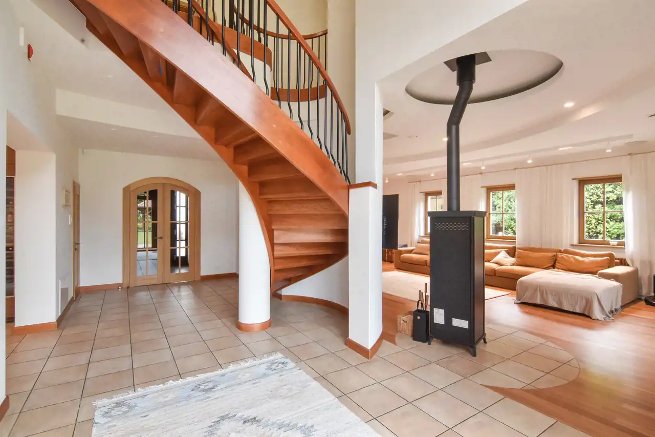 Na parterze znajduje się przestronny salon z najnowszej generacji bardzo wydajnym kominkiem firmy Thermossi, który jest sprzężony z systemem grzewczym i może zapewnić ciepło dla całego domu. Dalej przechodzimy do jadalni i kuchni z widokiem na piękny ogród i stawek oraz wyjściem na taras. Z drugiej strony wchodzimy na nastrojową, pięknie doświetloną werandę, w której można urządzić też ogród zimowy. Na dole (ale po dwóch różnych stronach domu), zlokalizowane są dwie sypialnie z łazienkami. Jedna z intymnym tarasem od wschodu oraz garderobą, połaczona jasnym korytarzem ze strefą spa. Druga natomiast bezpośrednio sąsiadująca z klimatyczną biblioteką.