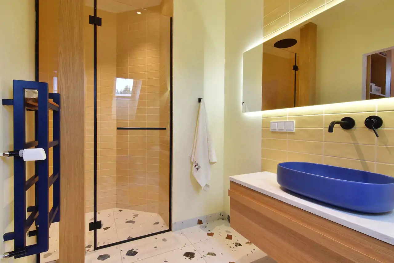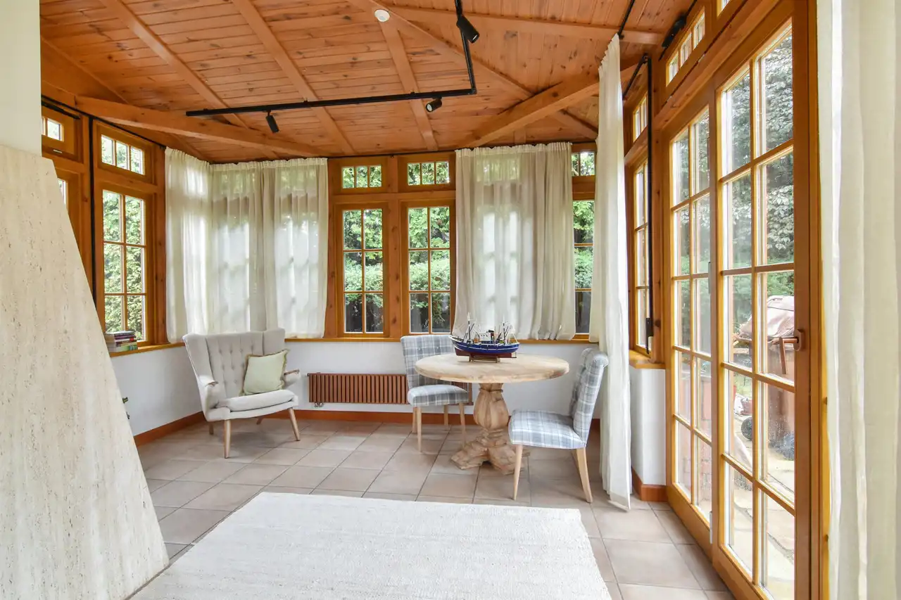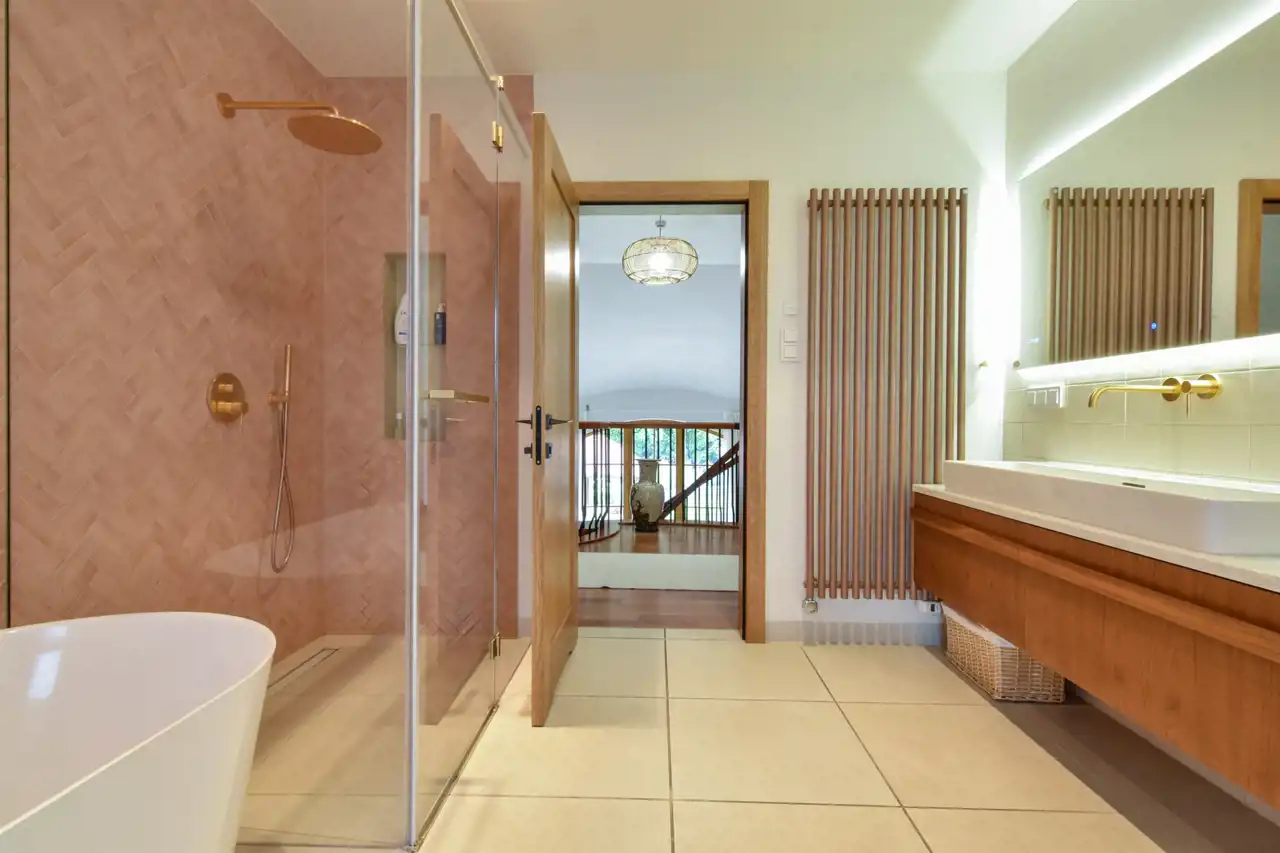 Na parterze znajduje się przestronny salon z najnowszej generacji bardzo wydajnym kominkiem firmy Thermossi, który jest sprzężony z systemem grzewczym i może zapewnić ciepło dla całego domu. Dalej przechodzimy do jadalni i kuchni z widokiem na piękny ogród i stawek oraz wyjściem na taras. Z drugiej strony wchodzimy na nastrojową, pięknie doświetloną werandę, w której można urządzić też ogród zimowy. Na dole (ale po dwóch różnych stronach domu), zlokalizowane są dwie sypialnie z łazienkami. Jedna z intymnym tarasem od wschodu oraz garderobą, połaczona jasnym korytarzem ze strefą spa. Druga natomiast bezpośrednio sąsiadująca z klimatyczną biblioteką.