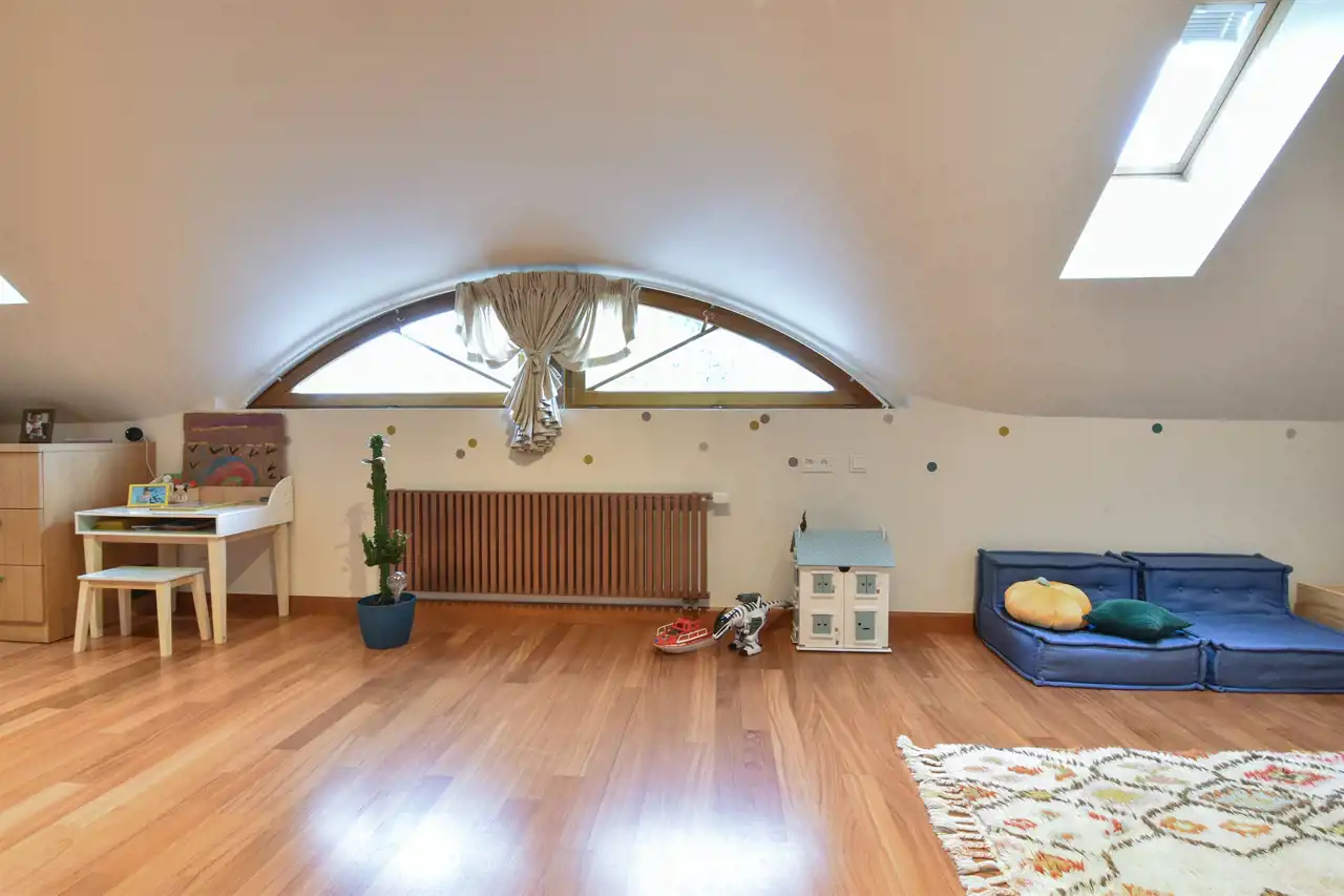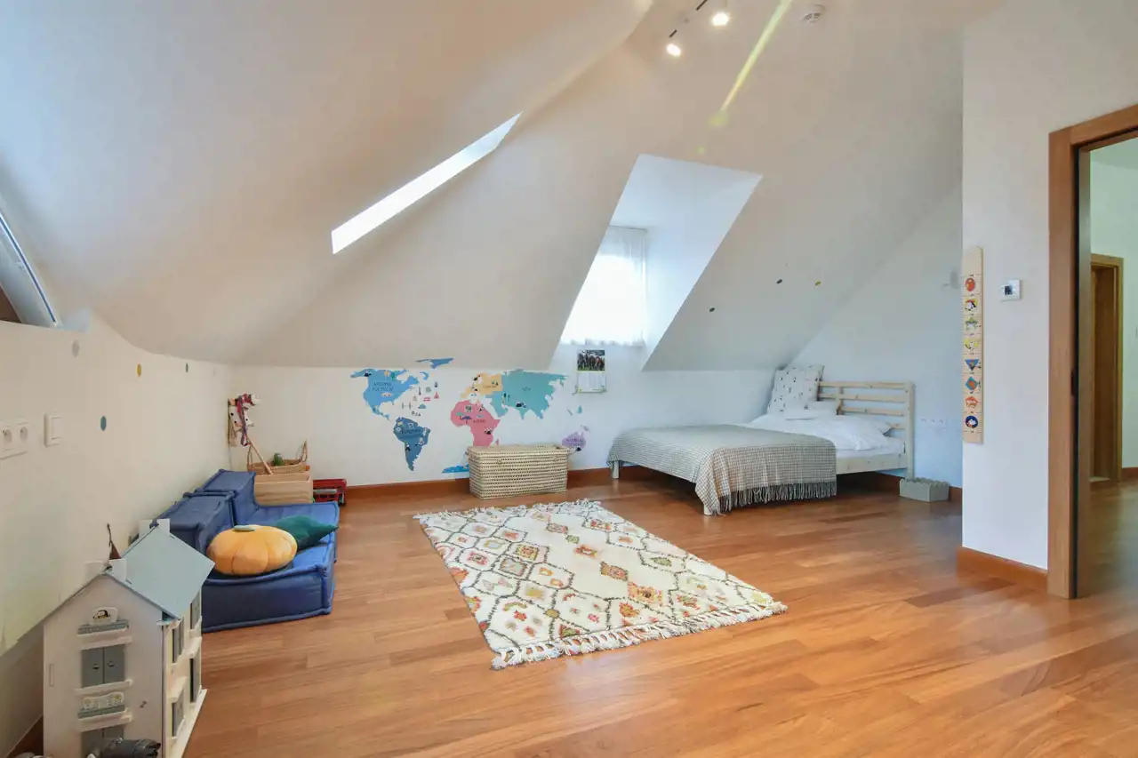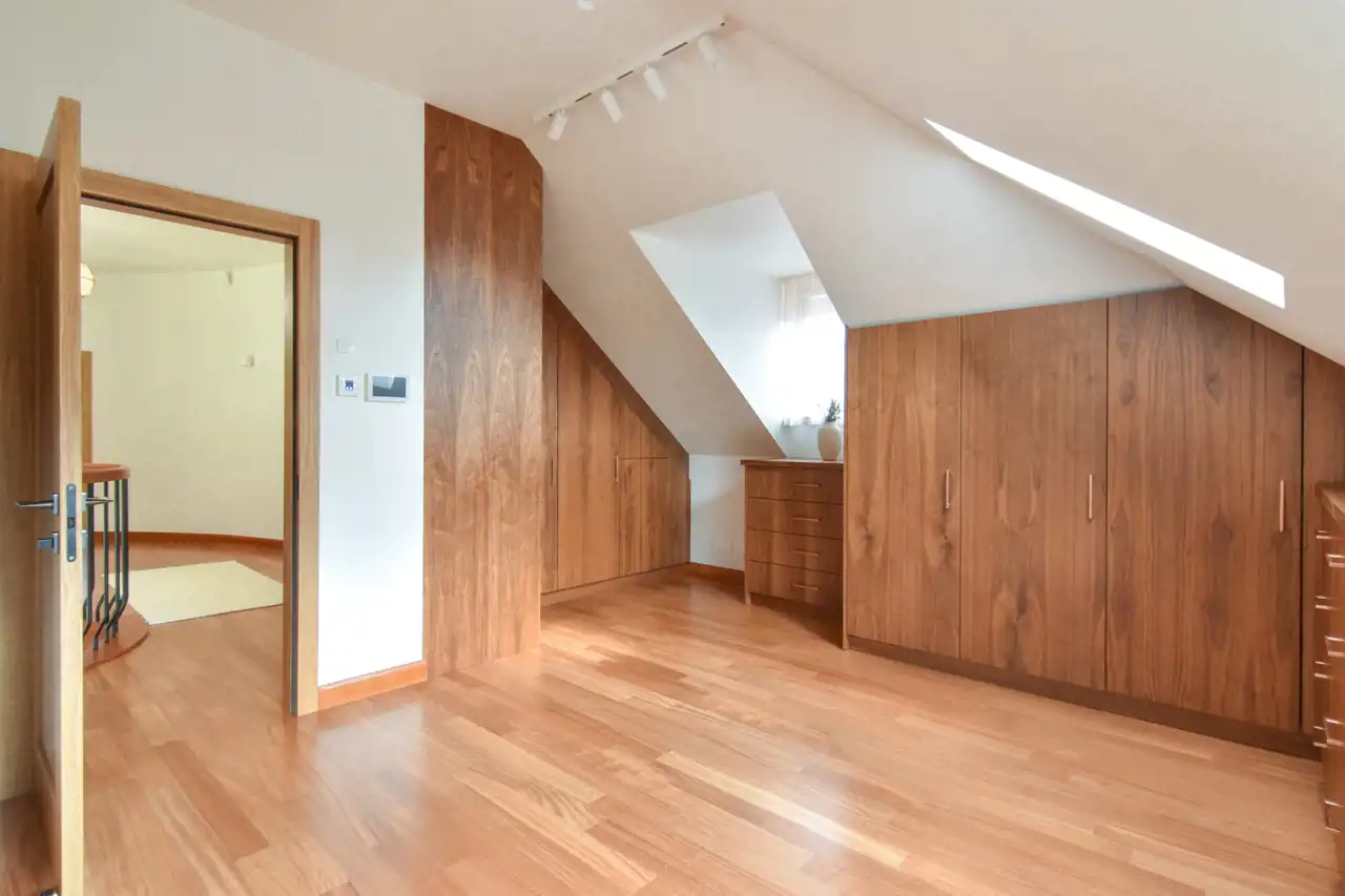 Bardzo słoneczne jest piętro głównego budynku (królestwo dla młodzieży), zagospodarowane zostało 3-ma sypialniami i 2-ma łazienkami (jedna z wyjściem na balkon). Na piętro prowadzą nowoczesne, piękne drewniane schody.