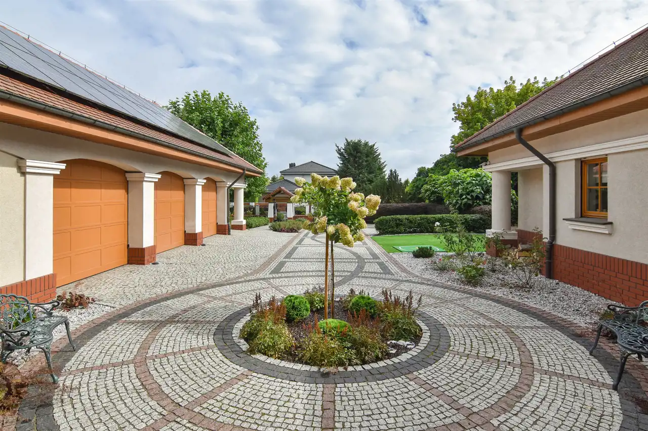 Do rezydencji prowadzi elegancki podjazd z przestronnym parkingiem, obok którego jest miejsce do gry w koszykówkę.