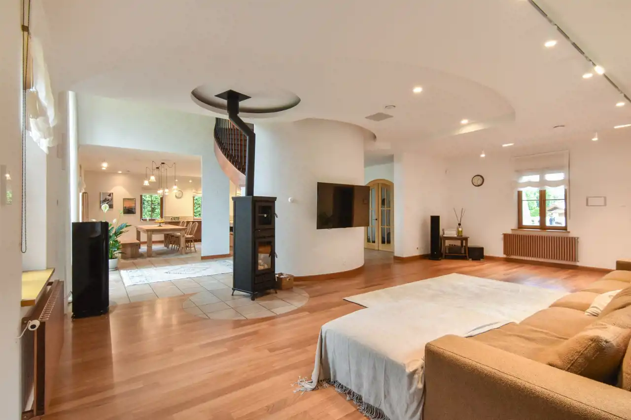 Przebywając tam, czuje się wyraźnie pozytywną aurę. Zastosowano również najnowsze rozwiązania zwiazane z ekologicznym pozyskiwaniem energii - fotowoltaikę i pompę ciepła, co sprawia, że koszty utrzymania rezydencji są bardzo niskie. Nieruchomość posiada smart home (system Ampio), tak więc całkowicie zautomatyzowane są wszystkie jego systemy, można kierować nimi zarówno z domu, jak i zdalnie. Rzadziej spotykanym udogodnieniem, sprawiającym właścicielom wiele radości, jest system audio w domu i w ogrodzie.