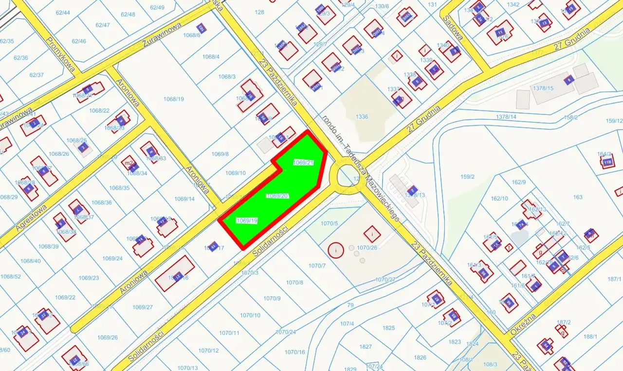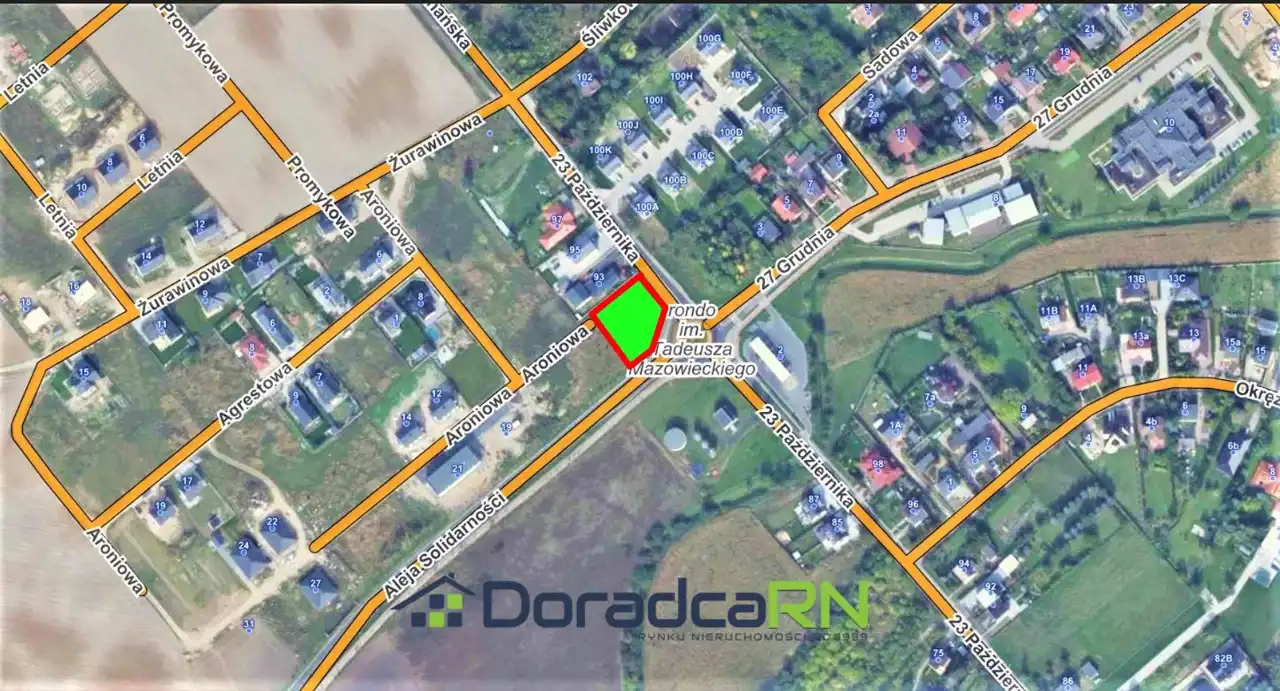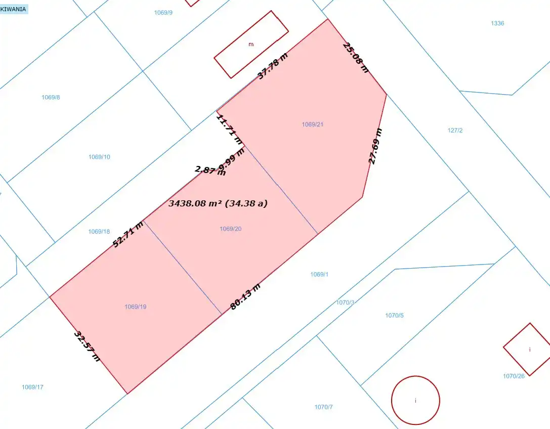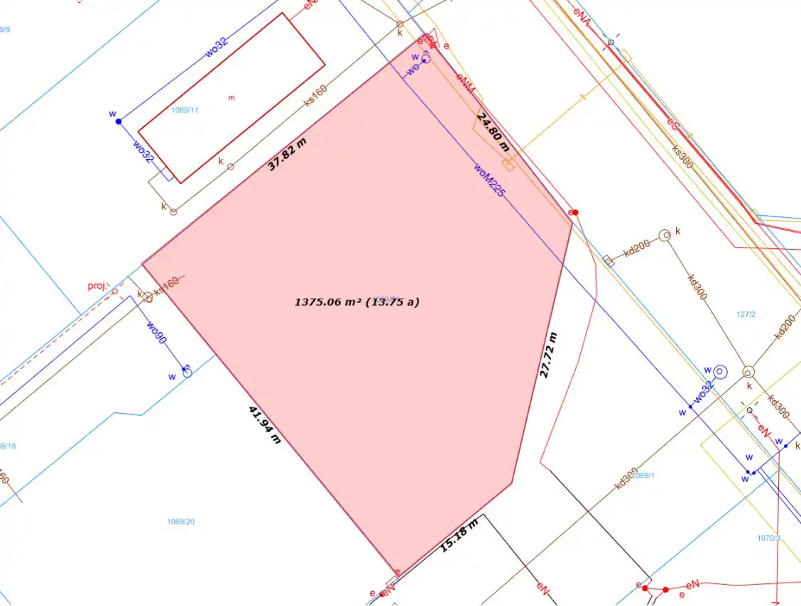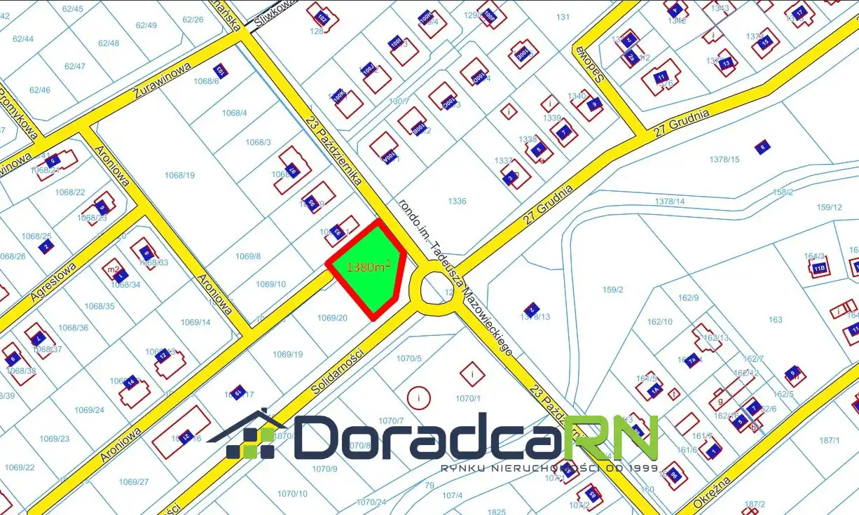 Powierzchnia działki 1380 m², regularny foremny kształt, oryginalna lokalizacja, dobra widoczność marketingowa.