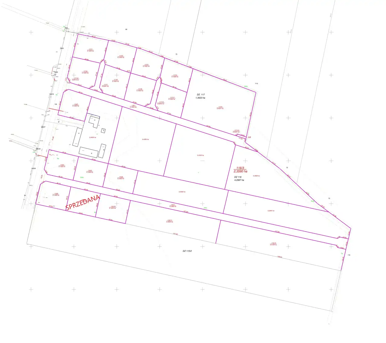Położona w kompleksie kilkunastu działek o podobnej powierzchni z wewnętrzną drogą o szerokości 8m zakończoną wysepką do zawracania o wymiarach 12m x 12m.