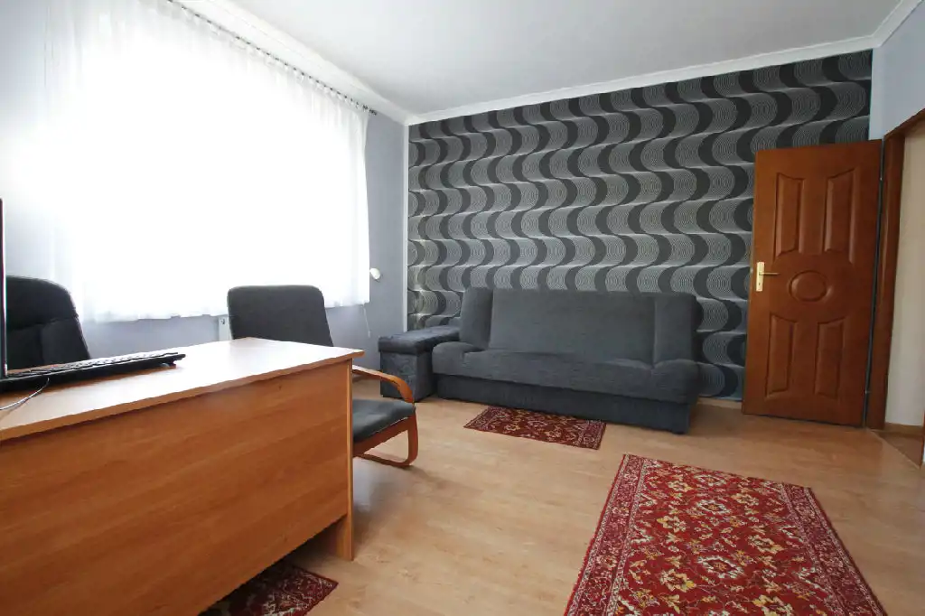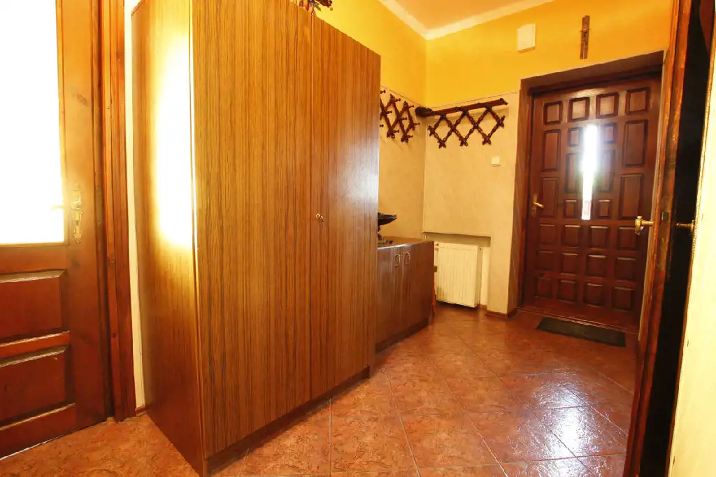 W domu znajduje się przestronny salon o pow. 35 m2, kuchnia 9,50 m2, korytarz 7,50 m2, dwie łazienki wyposażone w wannę, kabinę prysznicową oraz 4 pokoje przestronne, ustawne o powierzchni 18,50 m2, 17 m2, 14,5 m2, 9,14 m2. W całym domu na ścianach gładzie, malowane, częściowo tapety. Na podłodze panele, terakota, parkiet. W łazienkach glazura i terakota nowego typu. W całym domu okna PCV, centralne ogrzewanie gazowe.