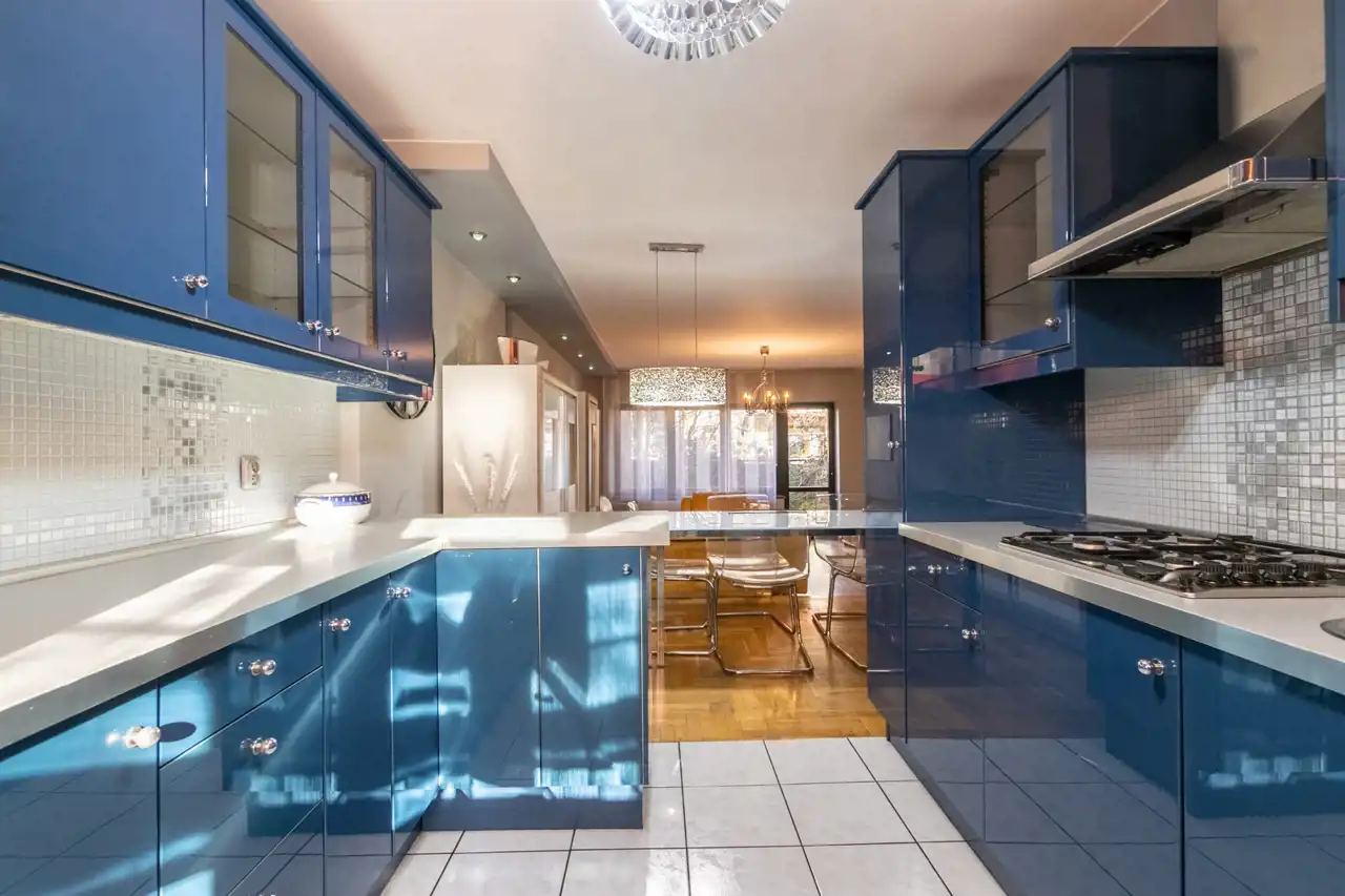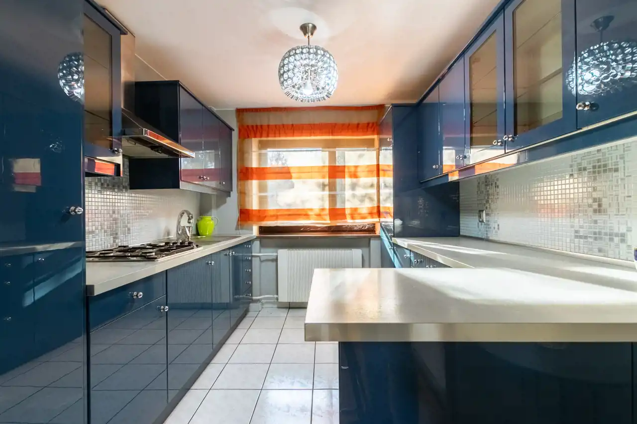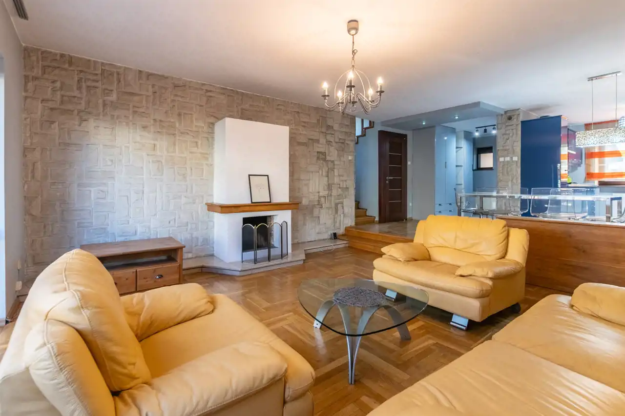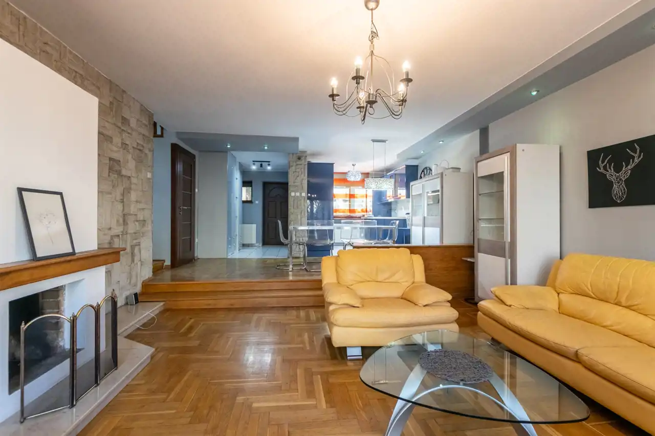 Kuchnia wyposażona w meble w zabudowie - lakierowane wraz ze sprzętem AGD. Salon wyposażony w kominek.
