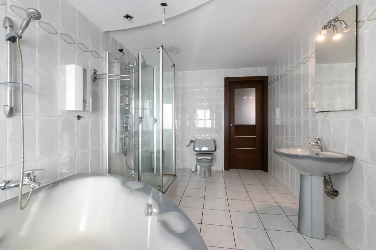 Ściany gładź malowana. Salon kąpielowy wyposażony w wannę i kabinę prysznicową.