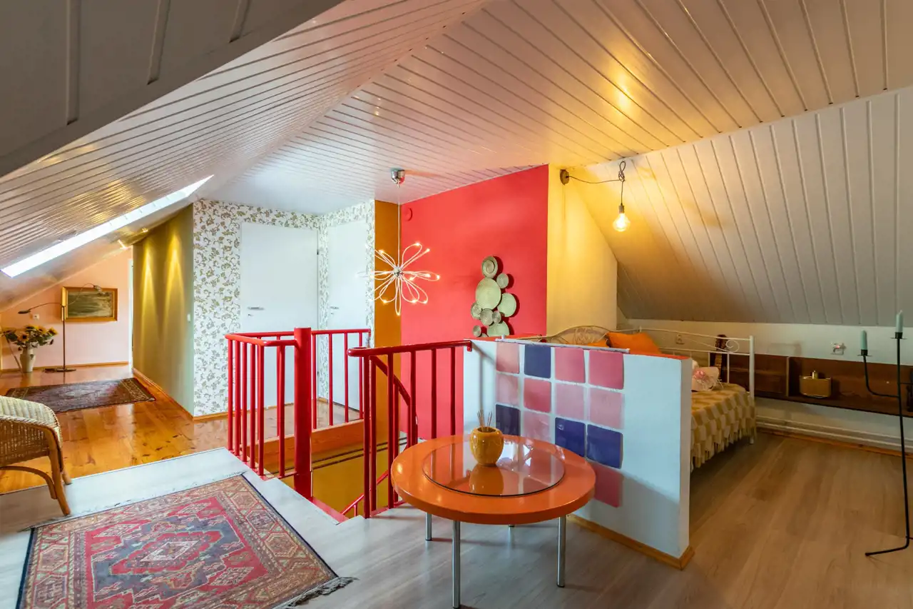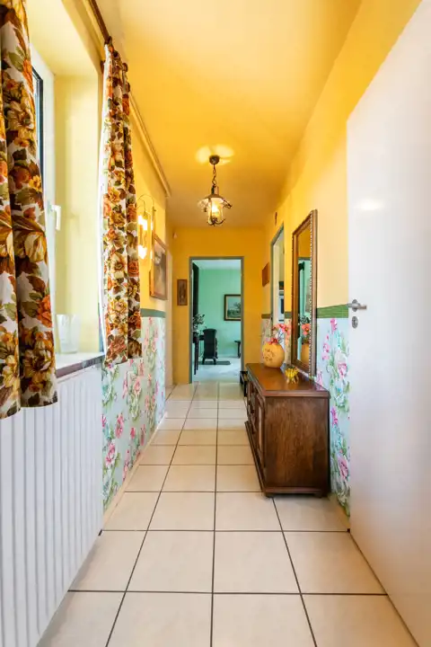 Na podłogach deski i panele, ściany malowane, miejscami z tapetami.