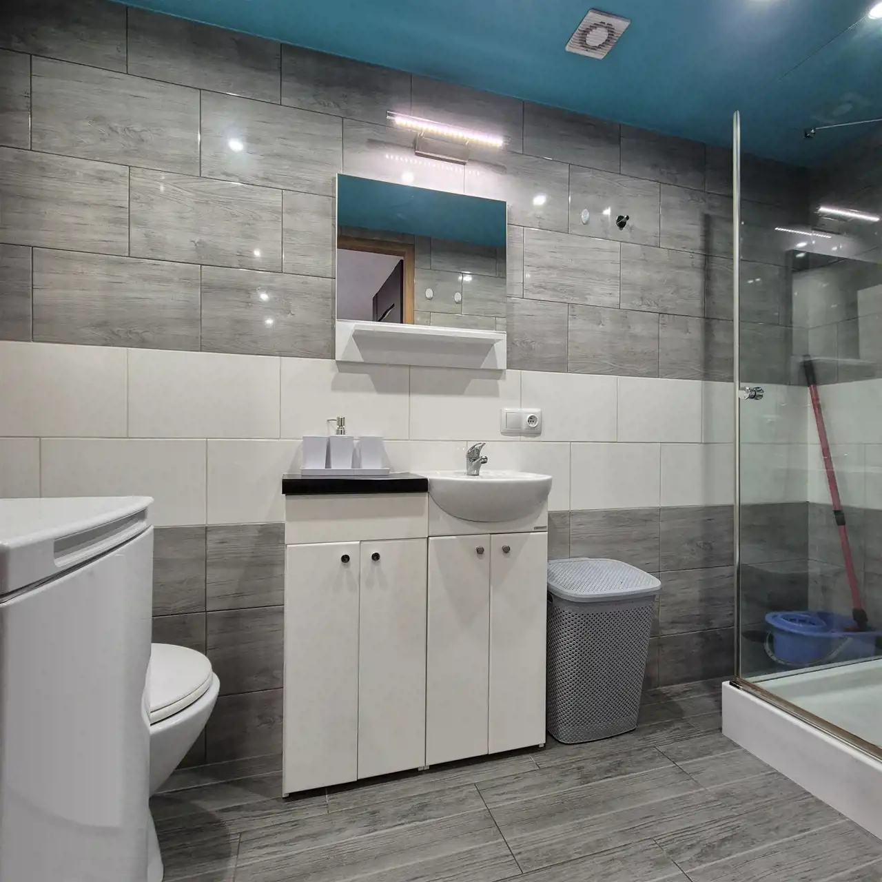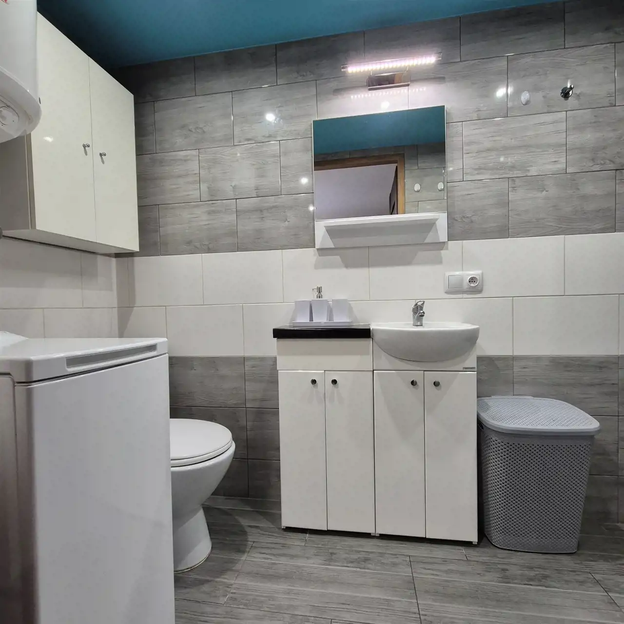 Łazienka: prysznic, wc, szafki, lustro, zlew, pralka, bojler