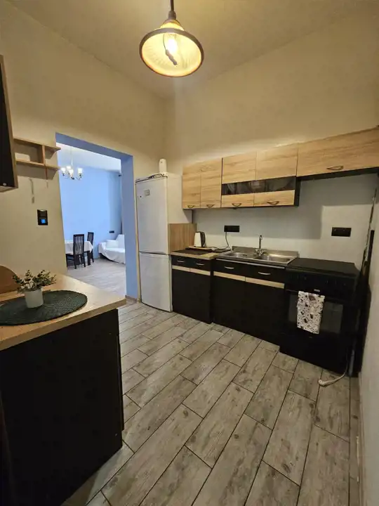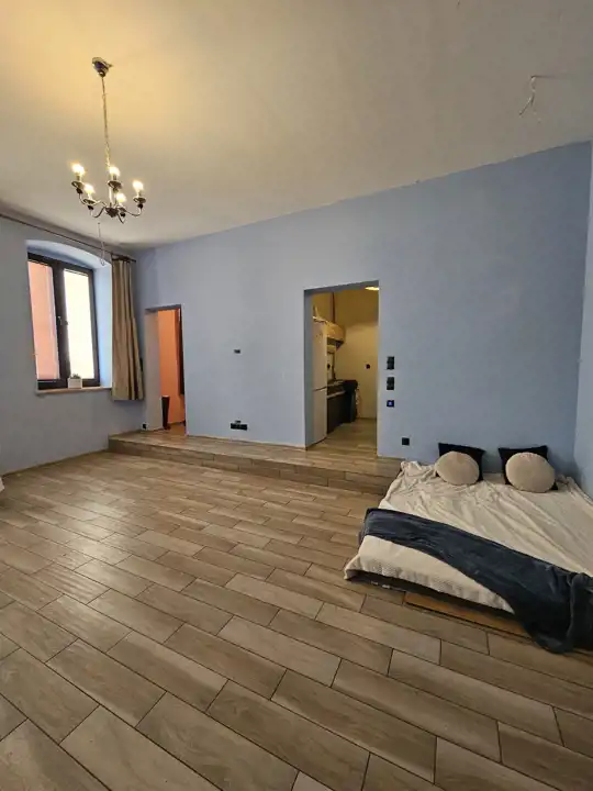 W salonie i sypialni znajdują się piękne, duże, drewniane, trzyszybowe okna wychodzące na zachód, parapety z konglomeratu. Mieszkanie jest wysokie, ma ponad 3 m. W całym mieszkaniu położone są płytki, zamontowane jest ogrzewanie podłogowe z dwufunkcyjnym piecem gazowym. Duży pokój jest położony niżej o ok 30 cm w stosunku do reszty mieszkania. Kuchnia jest bez okna, otwarta na salon. Łazienka wraz z toaletą i brodzikiem-nie ma zamontowanej kabiny prysznicowej. Na ścianach i podłogach płytki.