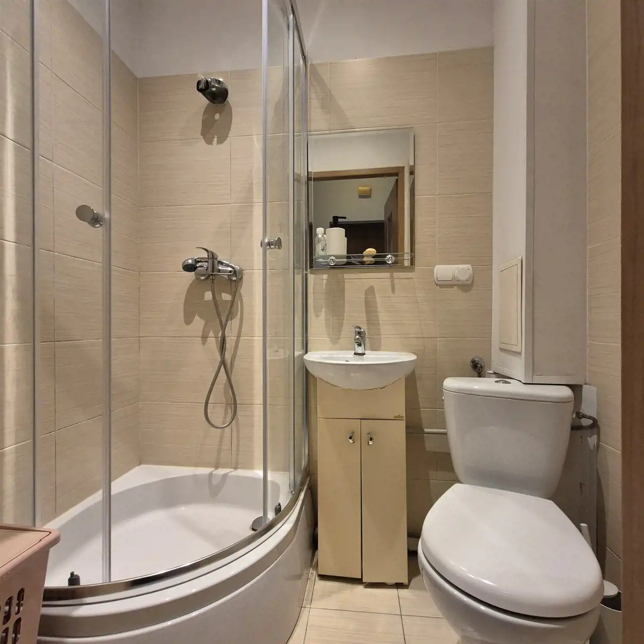 Łazienka: kabina prysznicowa, umywalka z armaturą, szafka pod umywalką, lustro, wc, oświetlenie