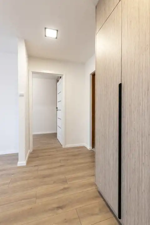 W mieszkaniu na podłogach panele, w części korytarzowej i kuchni płytka podłogowa.