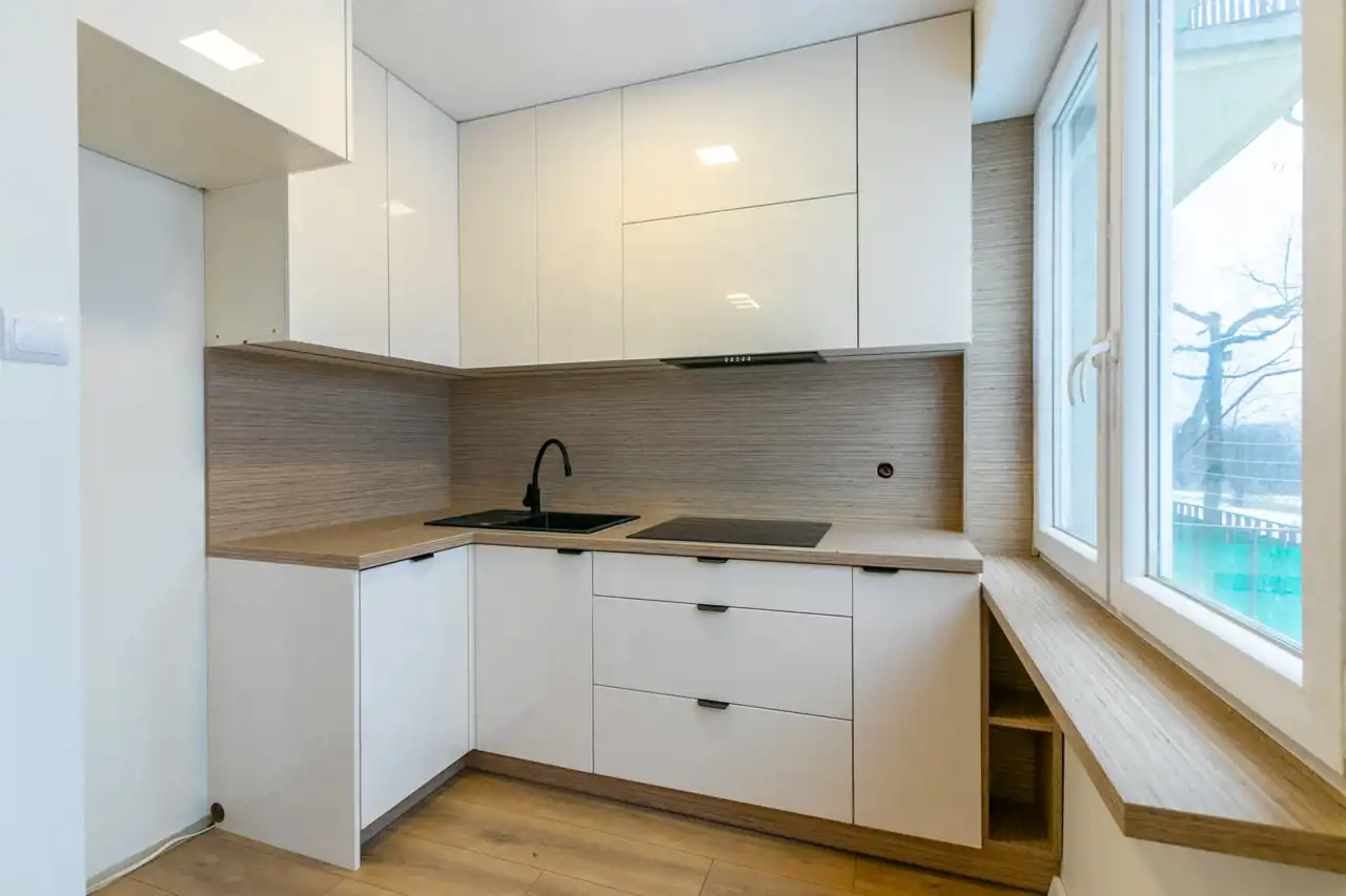 Meble kuchenne robione pod zamówienie w zabudowie stałej wraz z wyposażeniem AGD (lodówko- zamrażarka, zmywarka 45 cm, płyta indukcyjna, okap)