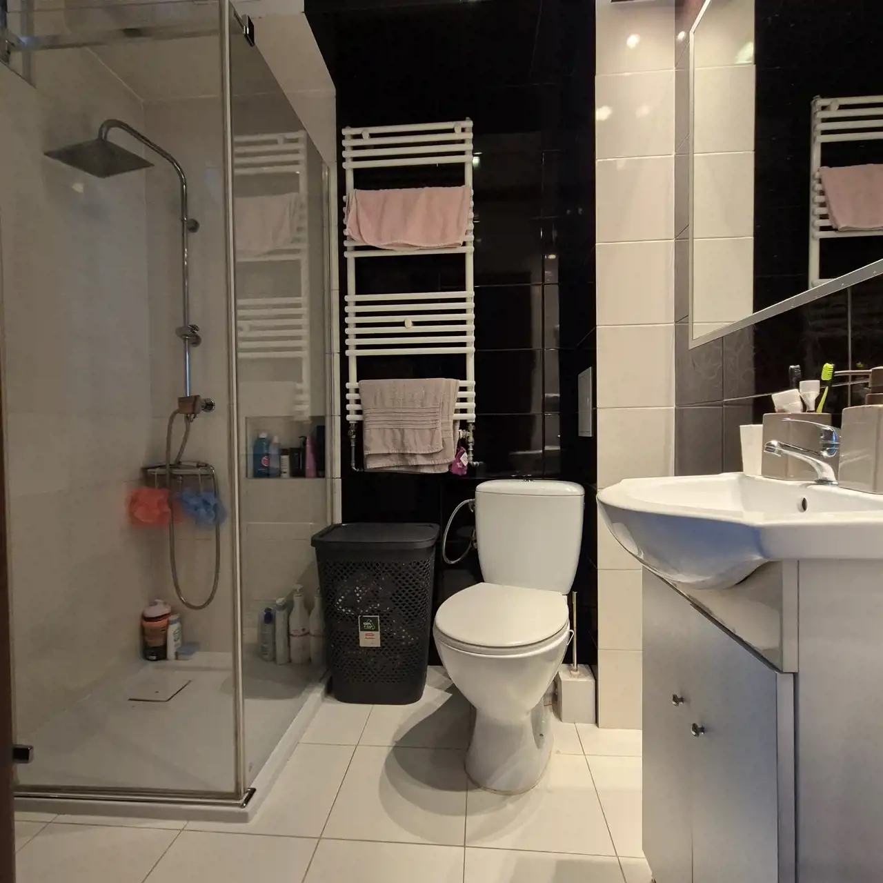 Łazienka: wc, prysznic, lustro, zlew z szafką