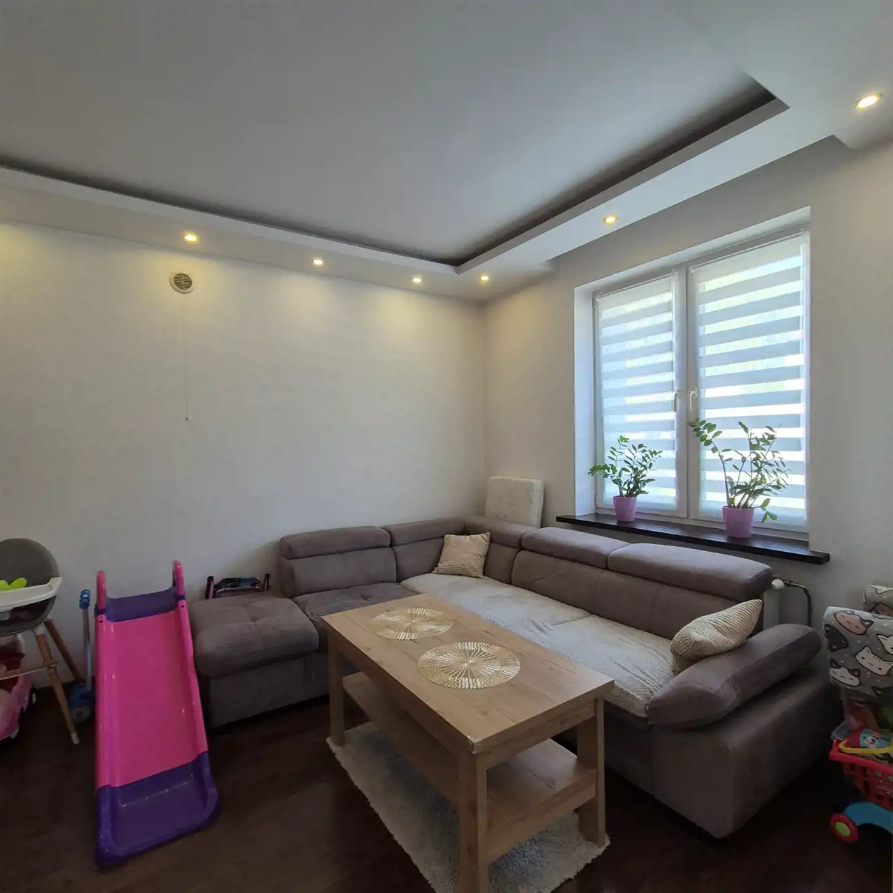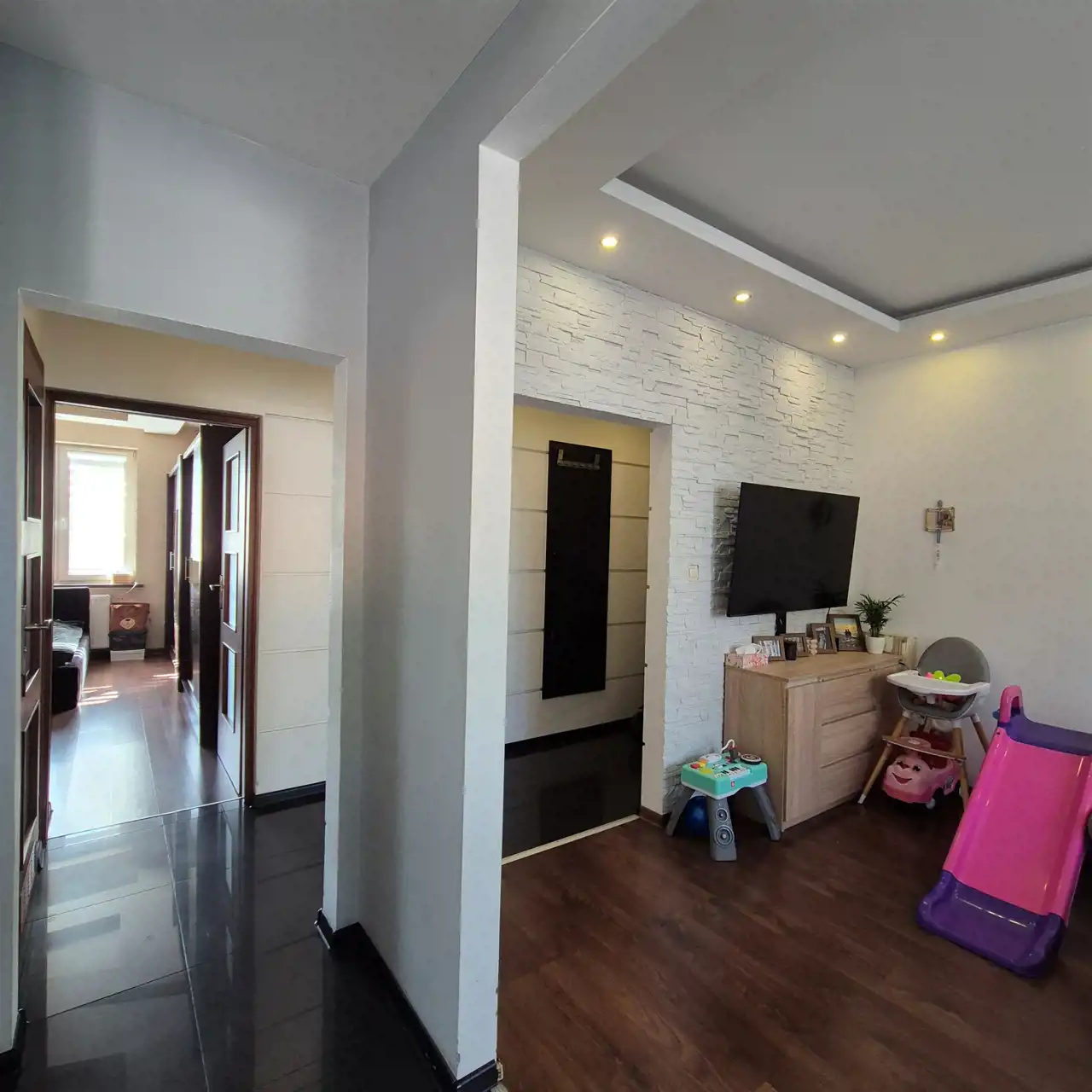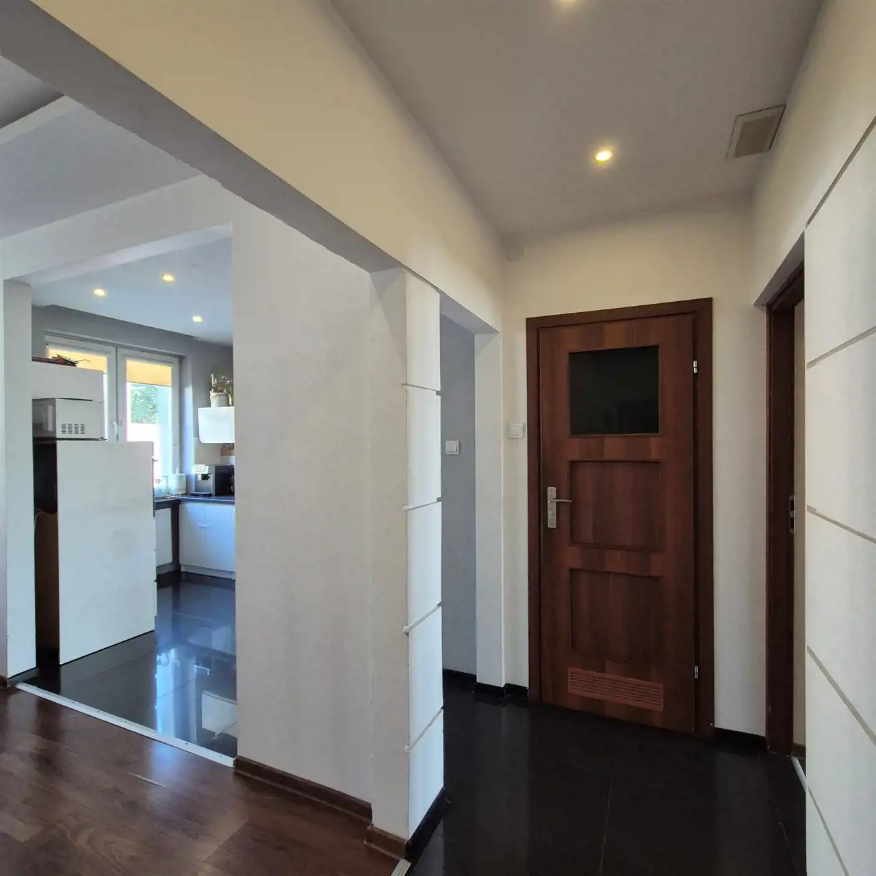 W mieszkaniu podwieszane sufity z oświetleniem halogenowym, na ścianach gładź oraz kamień ozdobny. W pokojach na podłodze panele. Kuchnia z nowoczesną zabudową pod wymiar, na podłodze gres dużego formatu, a na ścianach nowoczesna glazura. W łazience z wc na podłodze terakota, a na ścianach glazura.