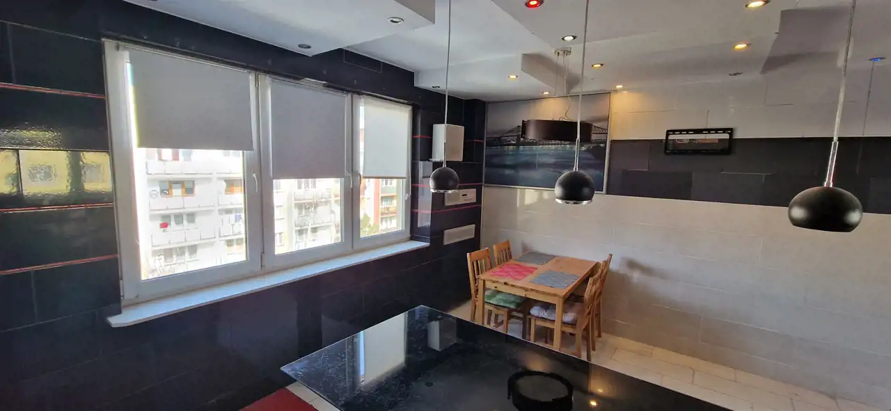 Wnętrze zostało zaaranżowane z dbałością o maksymalne wykorzystanie przestrzeni. W ramach zmiany układu funkcjonalnego połączono mniejszy pokój z kuchnią, tworząc przestronny i nowoczesny aneks kuchenny z częścią dzienną. Dzięki temu powstała otwarta, jasna przestrzeń stanowiąca centralny punkt mieszkania.
