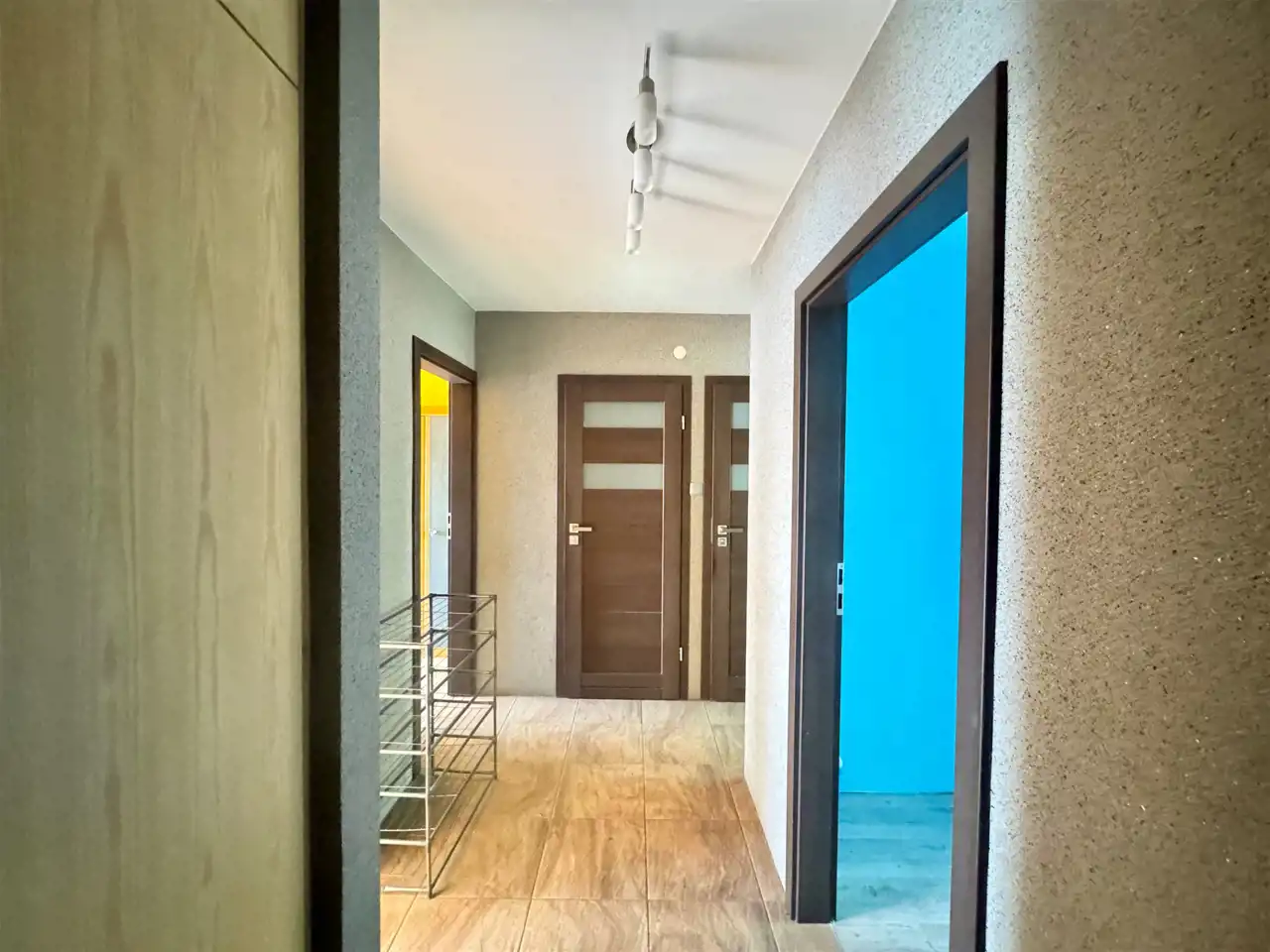 Mieszkanie składa się z trzech pokoi, w tym przestronnego salonu z wyjściem na balkon, dwóch sypialni, oddzielnej, naturalnie doświetlonej kuchni, łazienki oraz osobnej toalety. Układ pomieszczeń jest funkcjonalny i wygodny, idealny zarówno dla rodzin z dziećmi, jak i osób ceniących sobie komfort oraz dobrze zaplanowaną przestrzeń. Dużym atutem lokalu jest jego dwustronna ekspozycja – z jednej strony okna wychodzą na zielone, spokojne osiedle, z drugiej na kameralną zabudowę jednorodzinną, co nadaje lokalizacji podmiejski, przyjazny charakter i zapewnia ciszę oraz prywatność.