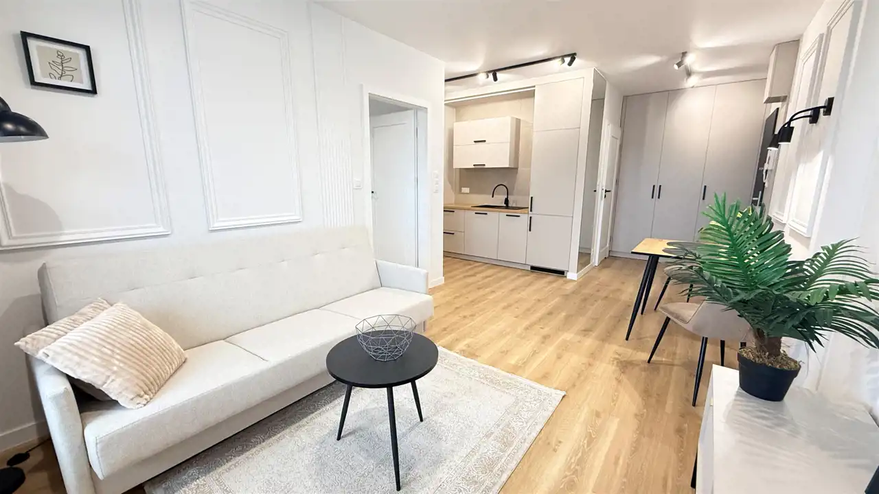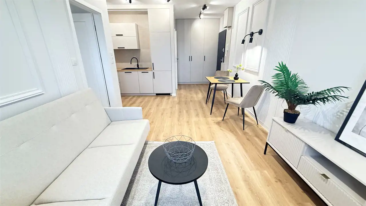 jasny salon z aneksem kuchennym, w pełni umeblowany i wyposażony