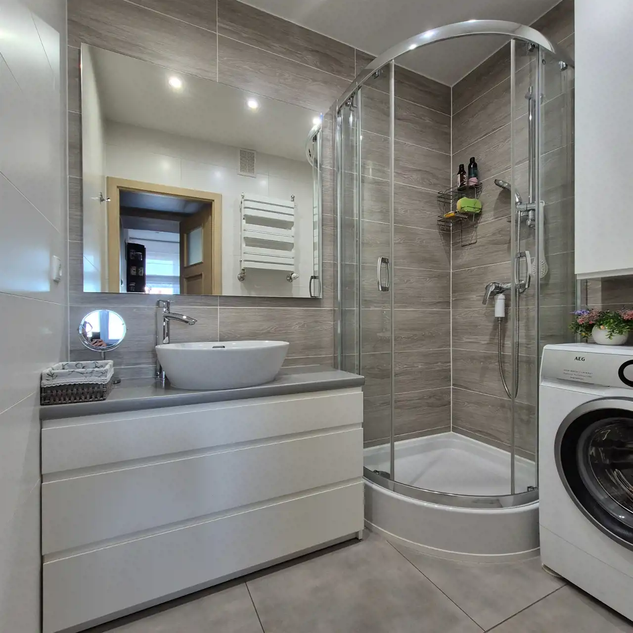 - kuchnia: płyta gazowa, piekarnik, lodówko-zamrażarka, okap, zmywarka, filtr do wody