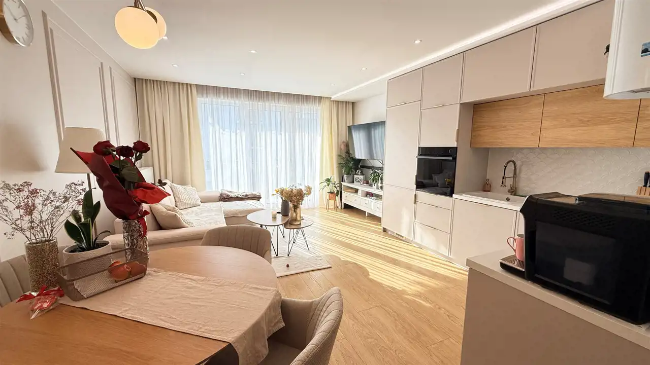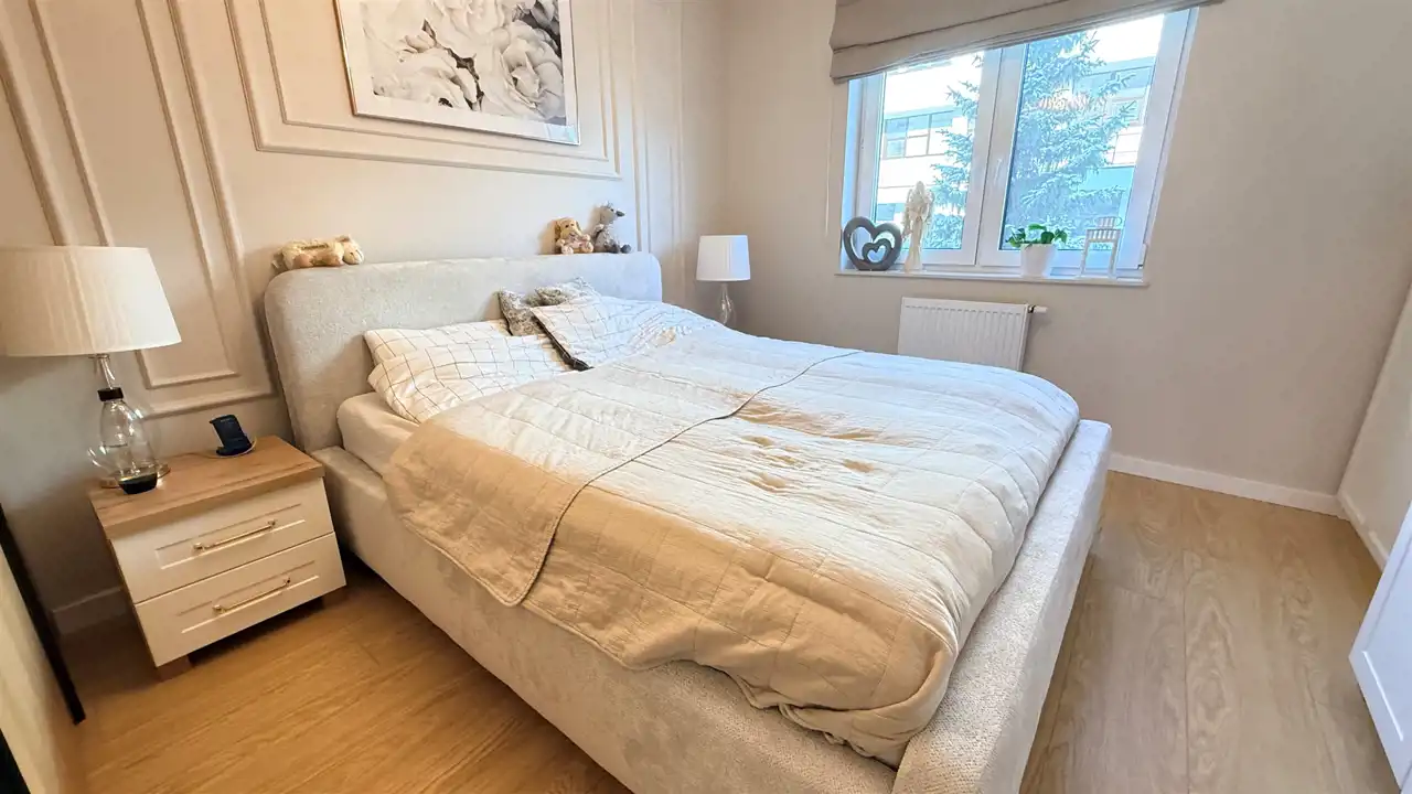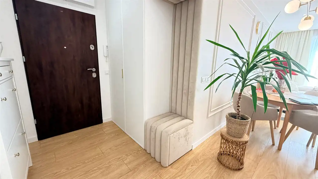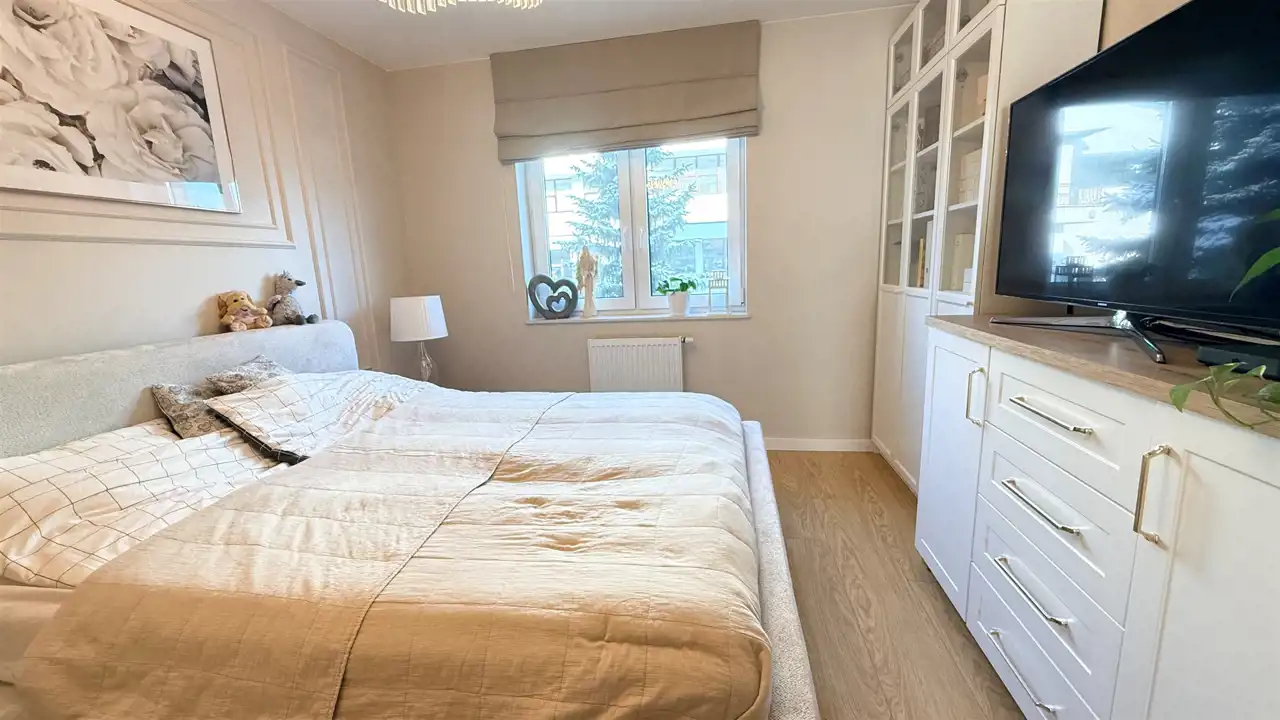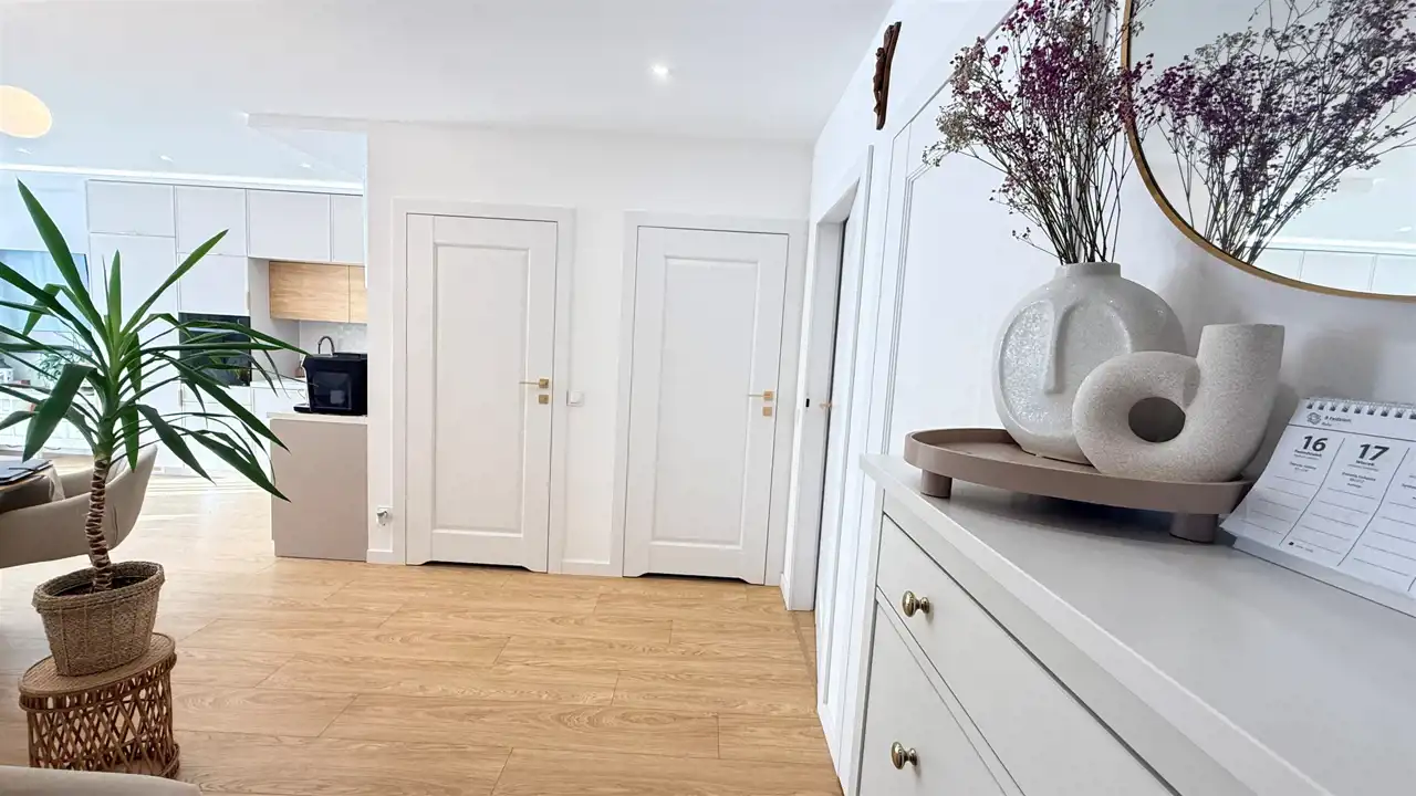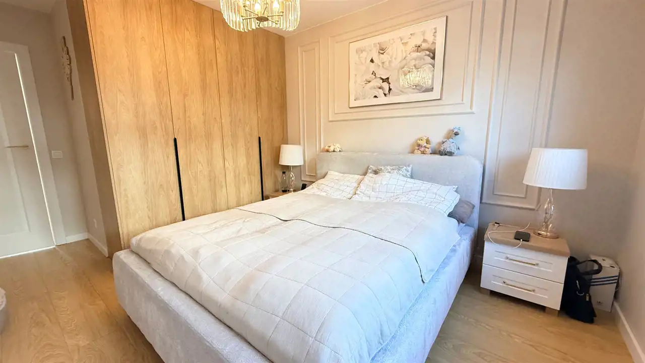 Lokal składa się z przestronnego salonu z aneksem kuchennym, dwóch komfortowych pokoi, łazienki oraz dużego, funkcjonalnego przedpokoju. Wnętrze zostało urządzone w jasnych, ponadczasowych odcieniach, co nadaje mu elegancji i sprawia, że przestrzeń jest jeszcze bardziej przestronna i przytulna. Mieszkanie jest w pełni umeblowane i gotowe do wprowadzenia – bez dodatkowych nakładów finansowych.