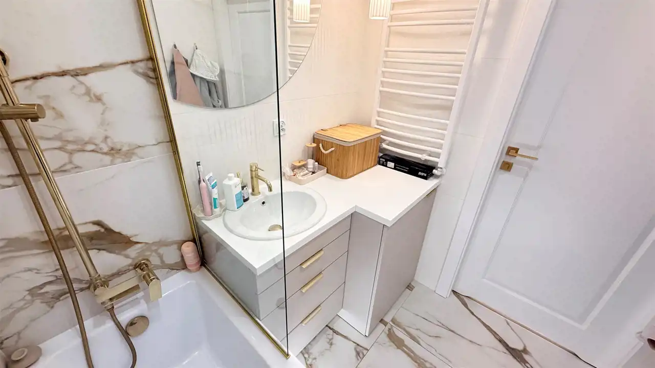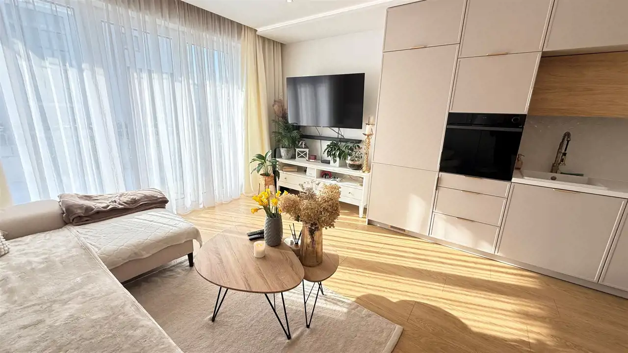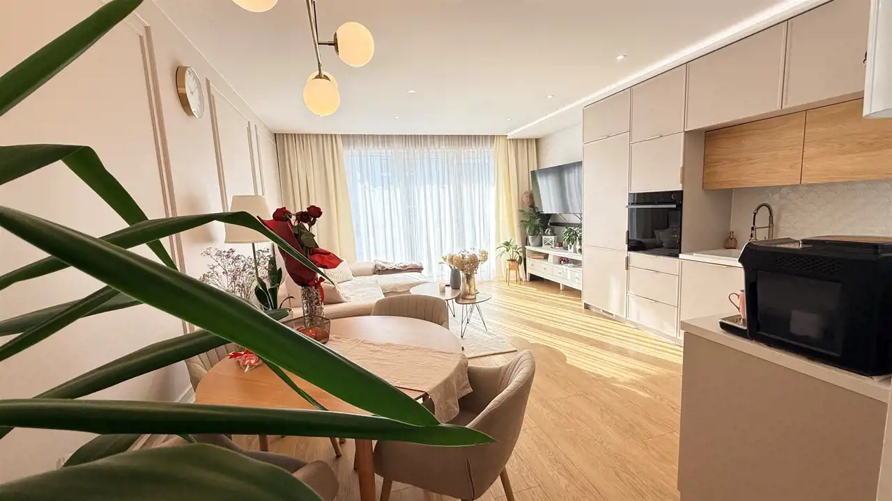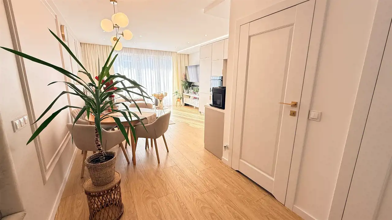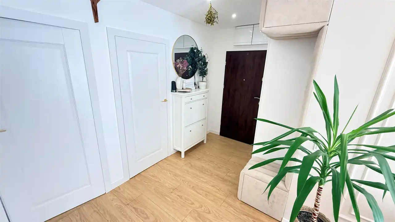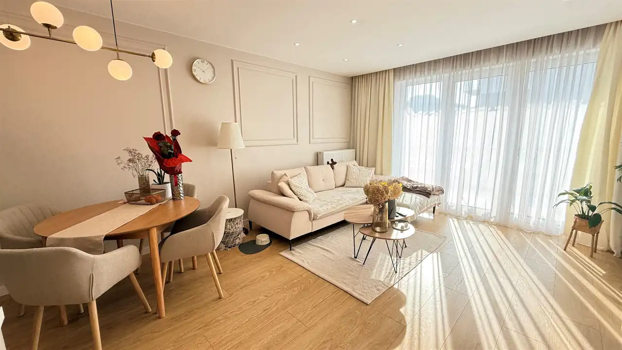 Lokal składa się z przestronnego salonu z aneksem kuchennym, dwóch komfortowych pokoi, łazienki oraz dużego, funkcjonalnego przedpokoju. Wnętrze zostało urządzone w jasnych, ponadczasowych odcieniach, co nadaje mu elegancji i sprawia, że przestrzeń jest jeszcze bardziej przestronna i przytulna. Mieszkanie jest w pełni umeblowane i gotowe do wprowadzenia – bez dodatkowych nakładów finansowych.