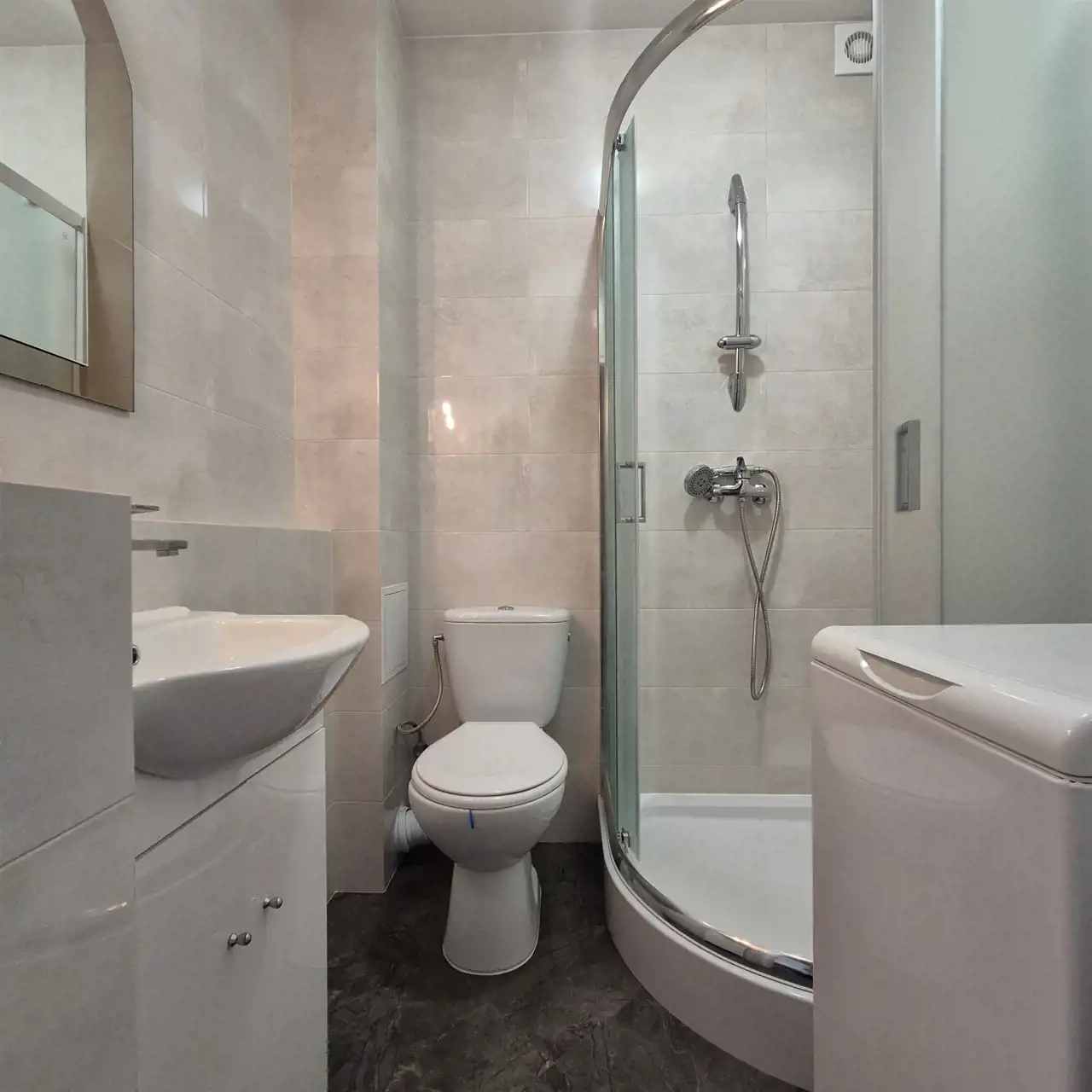 Łazienka z wc: prysznic, umywalka z armaturą, lustro, pralka, oświetlenie
