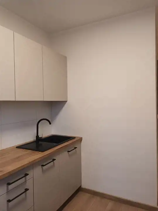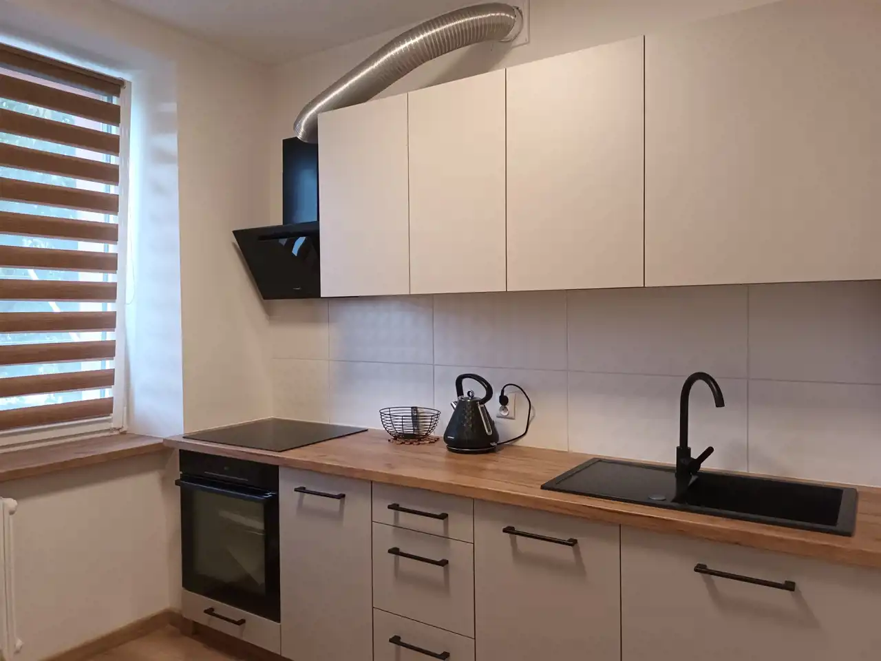 - Kuchnia: zabudowa kuchenna, stolik, krzesła, lodówko zamrażarka, okap, płyta indukcyjna, piekarnik, zlew z armaturą, oświetlenie