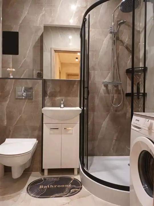 - Łazienka: szafka z lustrem, pralka, prysznic, szafka pod umywalką, wc, oświetlenie