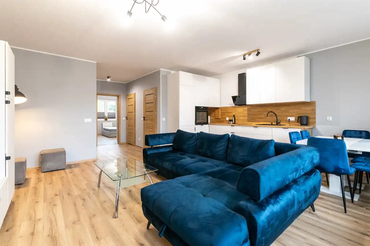 - Pokój dzienny z aneksem kuchennym i wyjściem na balkon