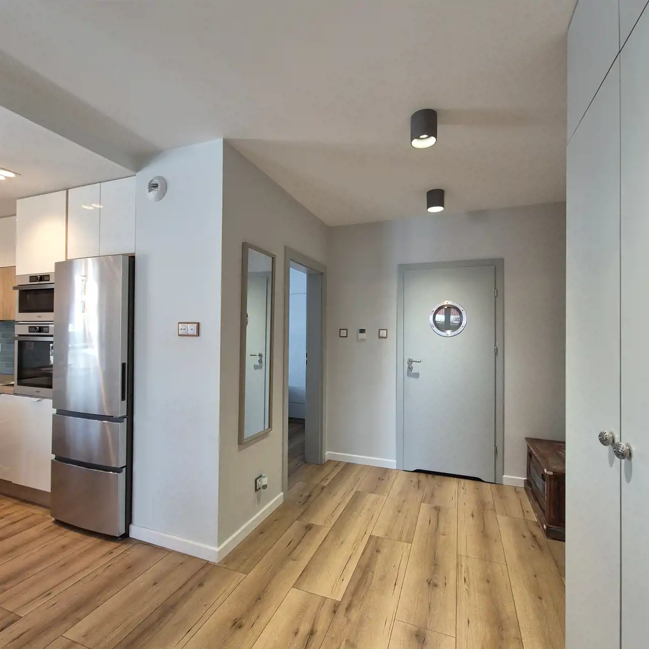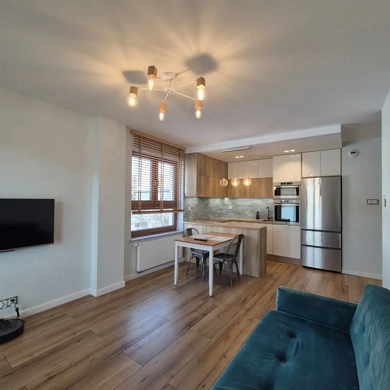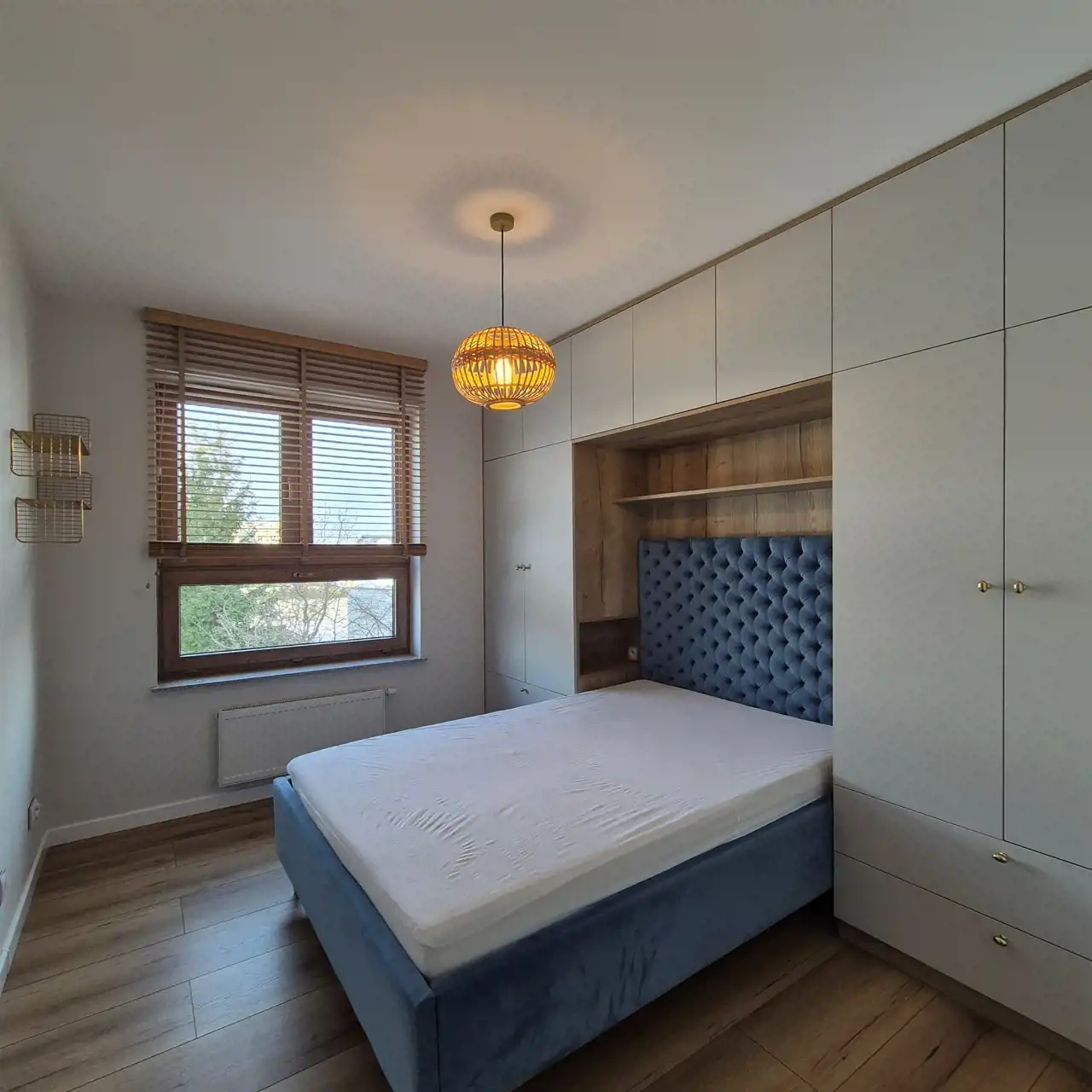 Mieszkanie w świetnej lokalizacji, funkcjonalne zaprojektowane w nowoczesnym stylu. W mieszkaniu okna PCV z roletami. Drzwi zewnętrzne antywłamaniowe. Całe mieszkanie w gładziach, pomalowane, podłoga w panelach i nowoczesnych płytkach. Aneks kuchenny z nowoczesną zabudową meblową ze sprzętem AGD (lodówka, piekarnik, płyta indukcyjna, zmywarka, okap, mikrofala) połączony z jadalnią ze stołem i krzesłami oraz salonem. W sypialni duża zabudowa meblowa z łóżkiem. Łazienka w płytkach, wyposażona w wannę, szafkę z umywalką, lustro, stelaż z miską wiszącą, szafki wiszące oraz pralkę. W p.pokoju szafa na wymiar. Mieszkanie w całości umeblowane.