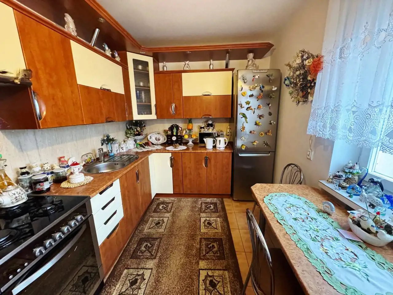 - Umeblowana kuchnia z płytkami na podłodze i ścianach,