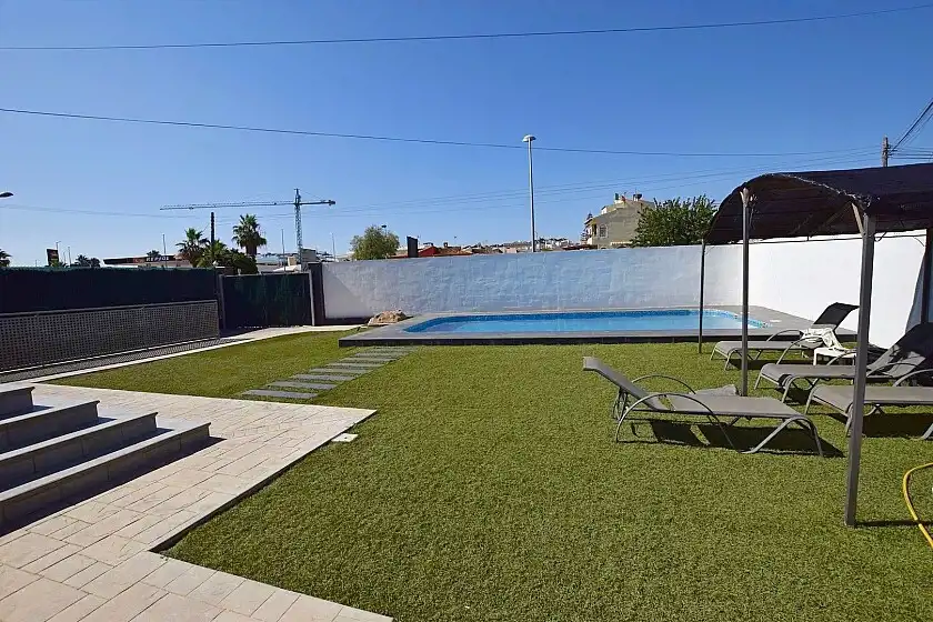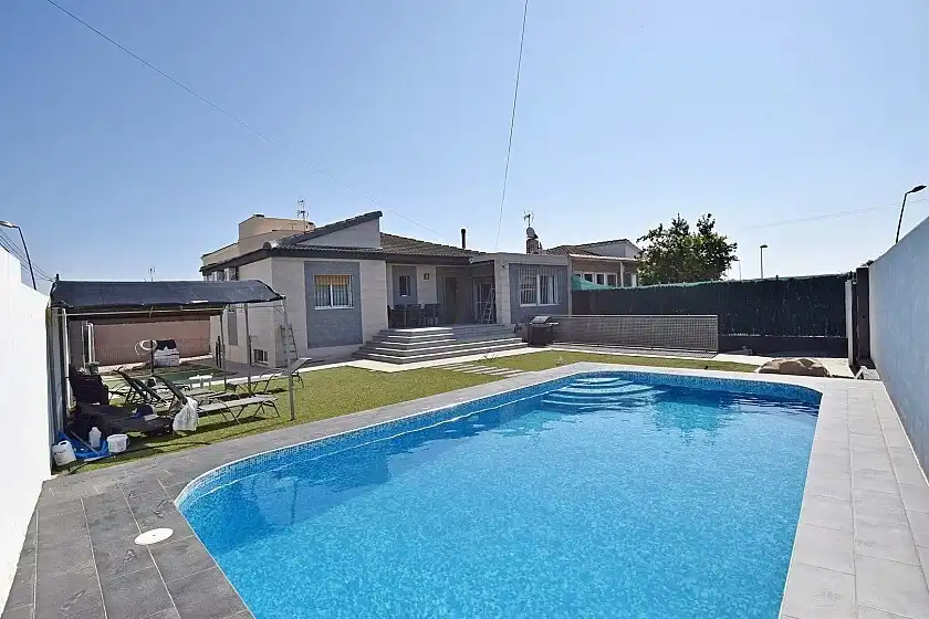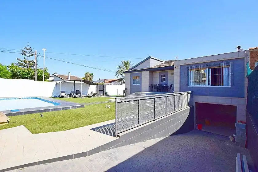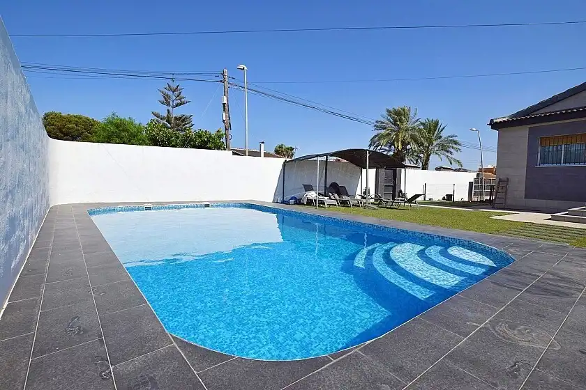 Przestronna wolnostojąca willa z 3 sypialniami i prywatnym basenem w Los Balcones. Ma 130 m² zabudowanej i składa się z przestronnego salonu z jadalnią z kominkiem, niezależnej wyposażonej kuchni, 3 sypialni i 2 łazienek. Główna sypialnia posiada garderobę i łazienkę. Półpiwnica ma 100 m², rozłożona na kilka pokoi, choć wciąż jest niedokończona. Dom posadowiony na działce o powierzchni 542 m², w pełni zagospodarowanej z prywatnym basenem i podjazdem do garażu podziemnego. Ciesz się również miejscem do grillowania. Lokalizacja tej willi w Los Balcones umożliwia dostęp do głównych atrakcji, w połowie drogi między centrum Torrevieja i Orihuela Costa, z kilkoma centrami handlowymi (Zenia Boulevard i Habaneras), supermarketami, barami i restauracjami, szpitalem publicznym, transportem publicznym i inne usługi. Kilka minut jazdy samochodem od plaż i zatoczek na południe od Torrevieja i wybrzeża Orihuela, a także bliskość pięciu pól golfowych w 15-20 minut samochodem. Oprócz łatwego dostępu do zjazdu z autostrady AP-7, z bezpośrednim połączeniem z lotniskami w Alicante i Murcji.