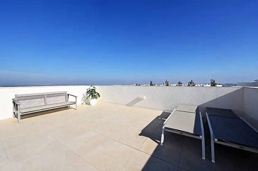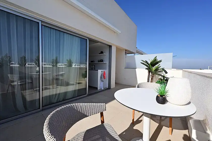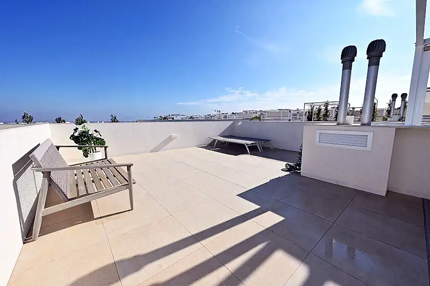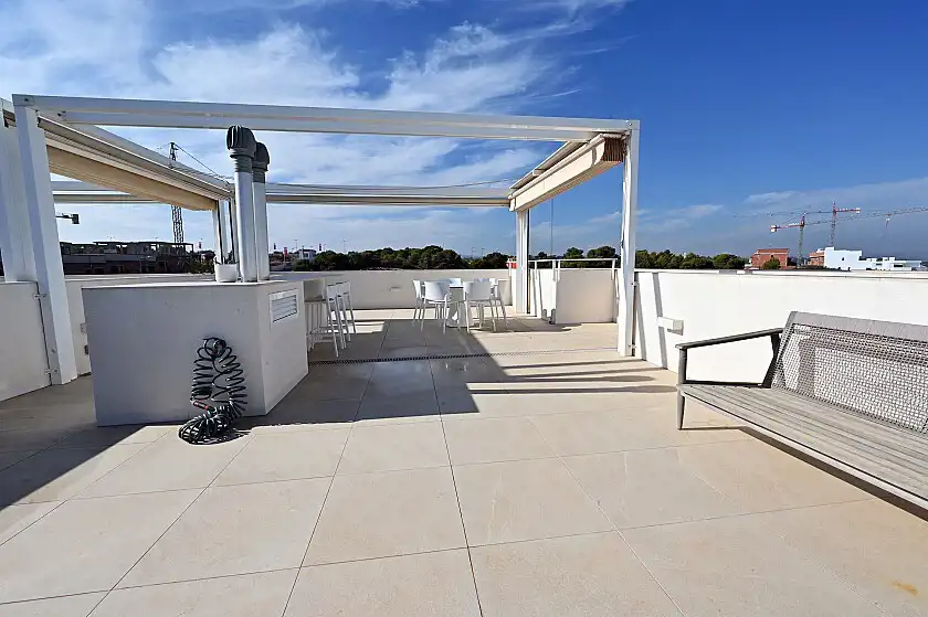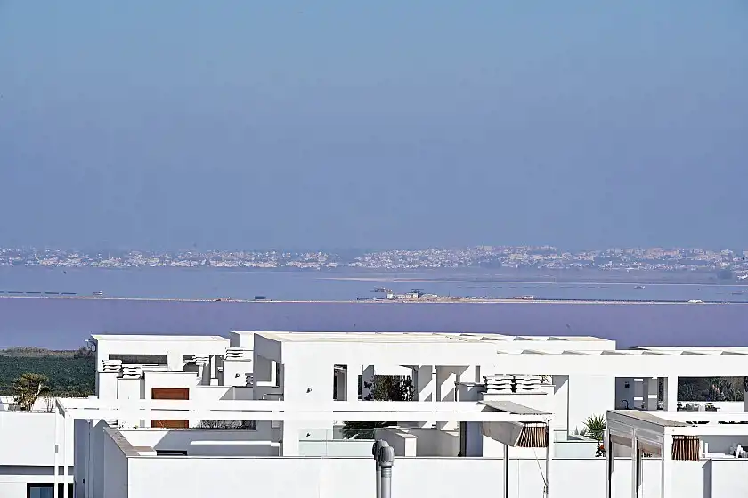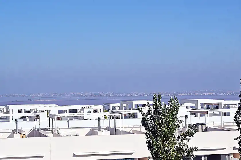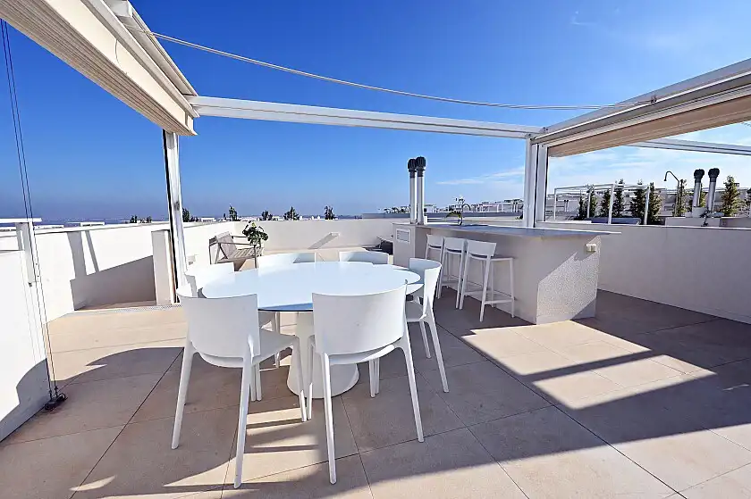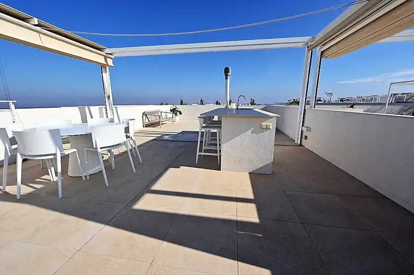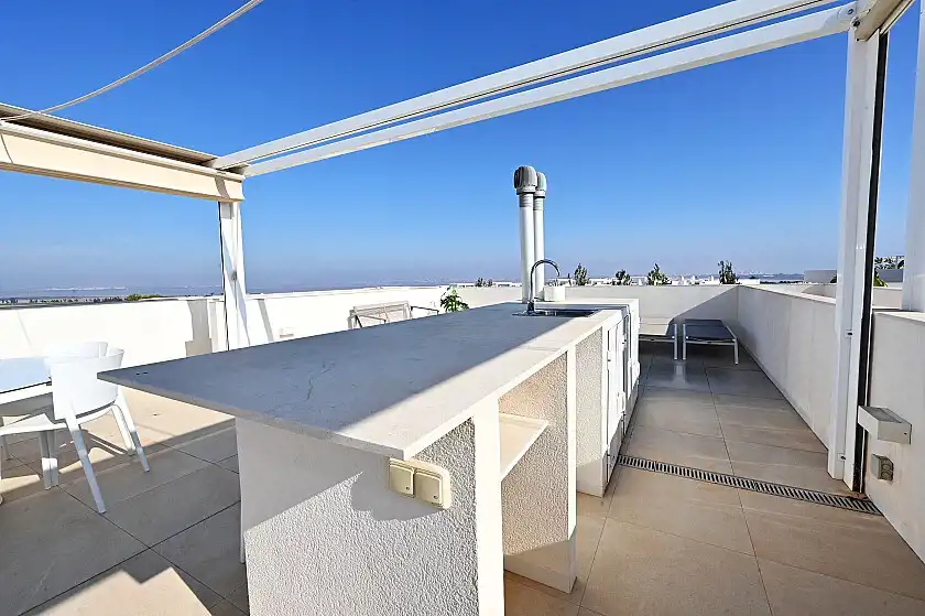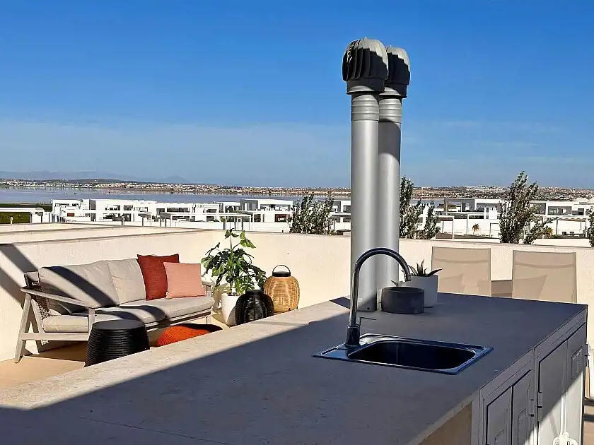 Piękny i przestronny taras z widokiem na tereny zielone i basen. Solarium z pięknym widokiem na Salinas de Torrevieja i morze, wyposażone w letnią kuchnię. Zaledwie 6 minut od plaży i 3 minuty od sklepów, barów i restauracji.