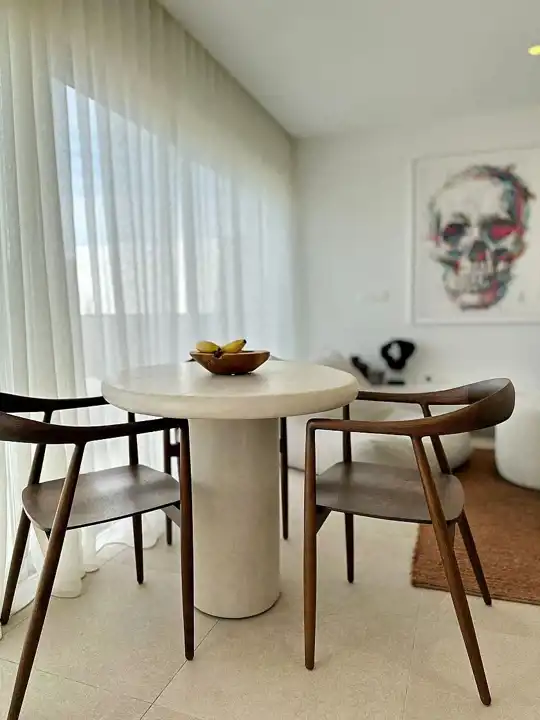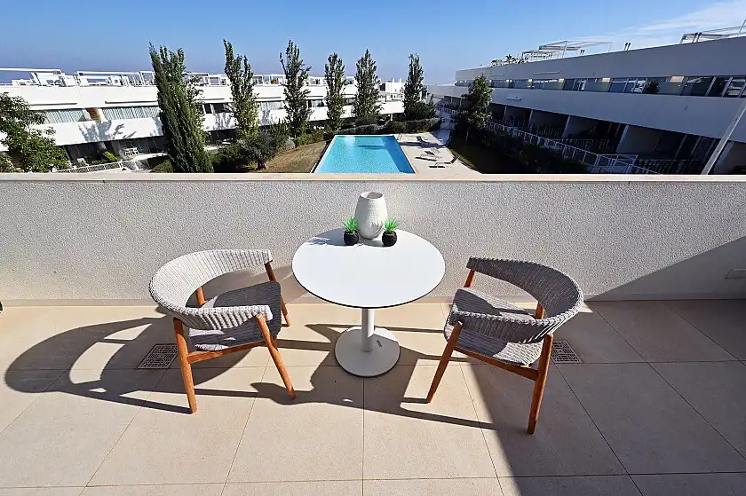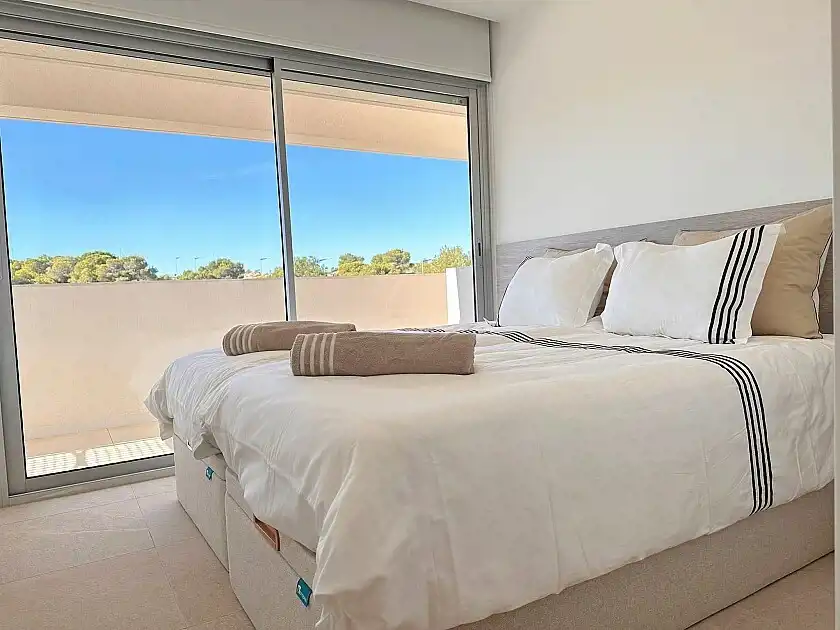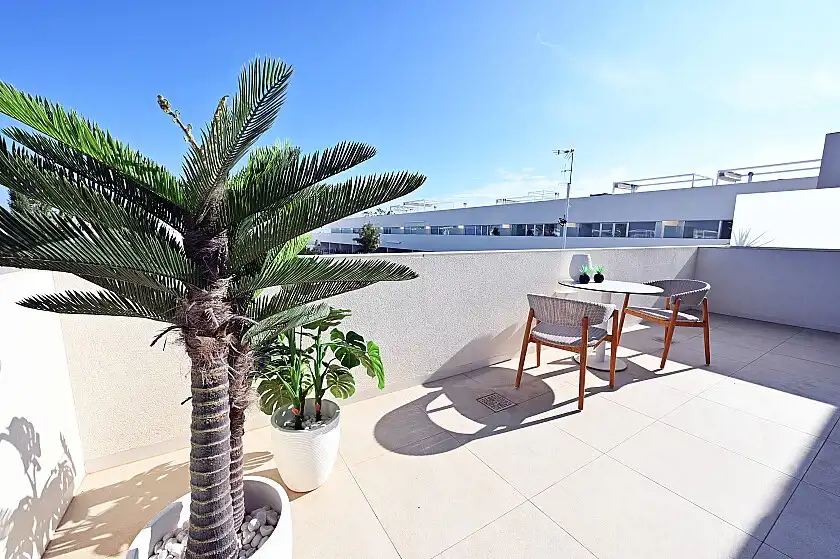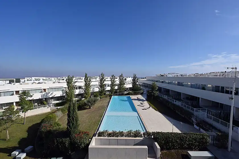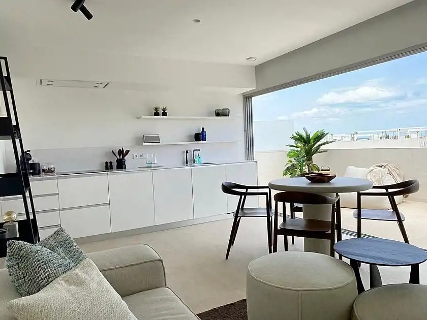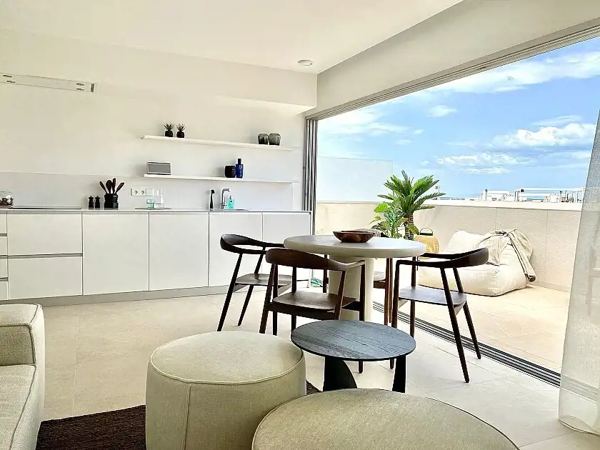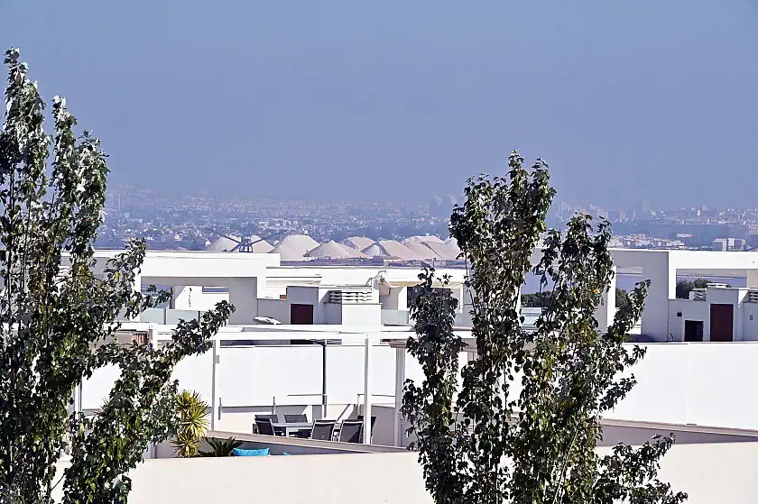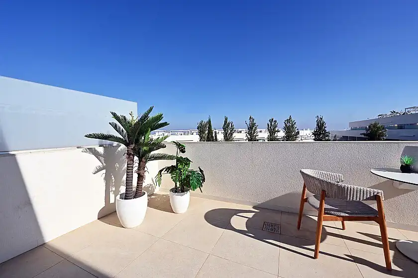 Piękny i przestronny taras z widokiem na tereny zielone i basen. Solarium z pięknym widokiem na Salinas de Torrevieja i morze, wyposażone w letnią kuchnię. Zaledwie 6 minut od plaży i 3 minuty od sklepów, barów i restauracji.
