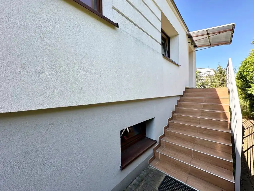 Powierzchnia całkowita domu wynosi 200 m2, natomiast powierzchnia mieszkalna 120 m2 – pozostała część to funkcjonalne zaplecze gospodarcze i garaż, które znacząco podnoszą komfort codziennego użytkowania.