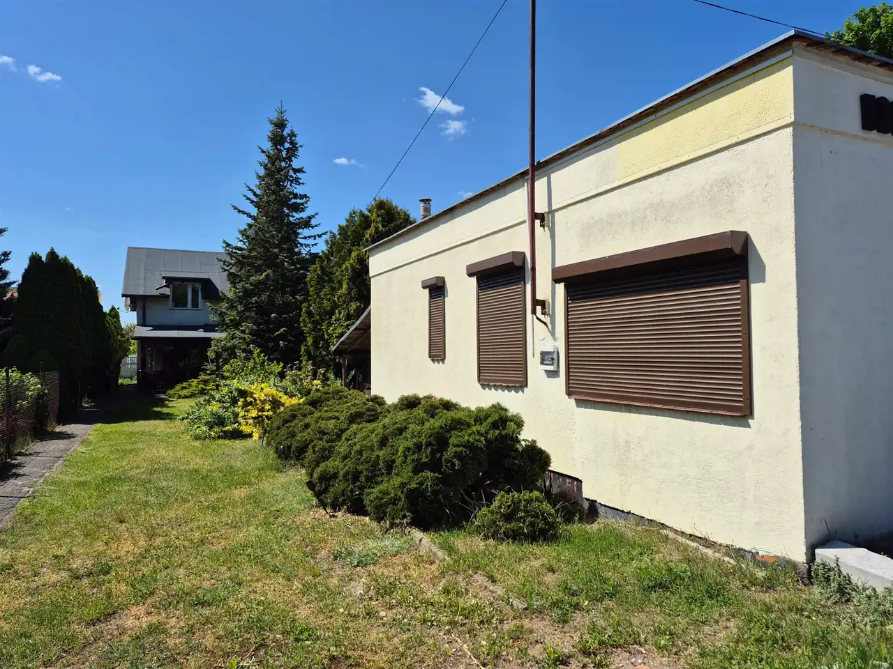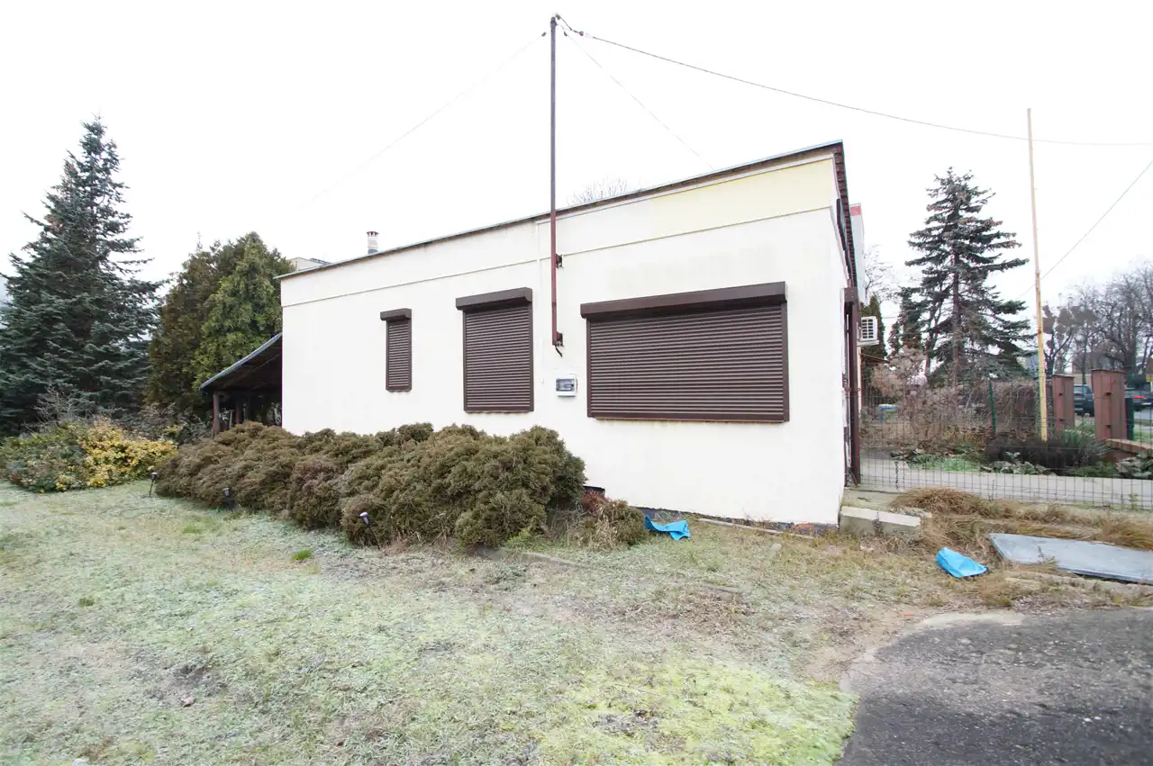 Parterowy budynek usługowy o powierzchni ok 70m2 składa się z kilku pomieszczeń i usytuowany jest z przodu działki.