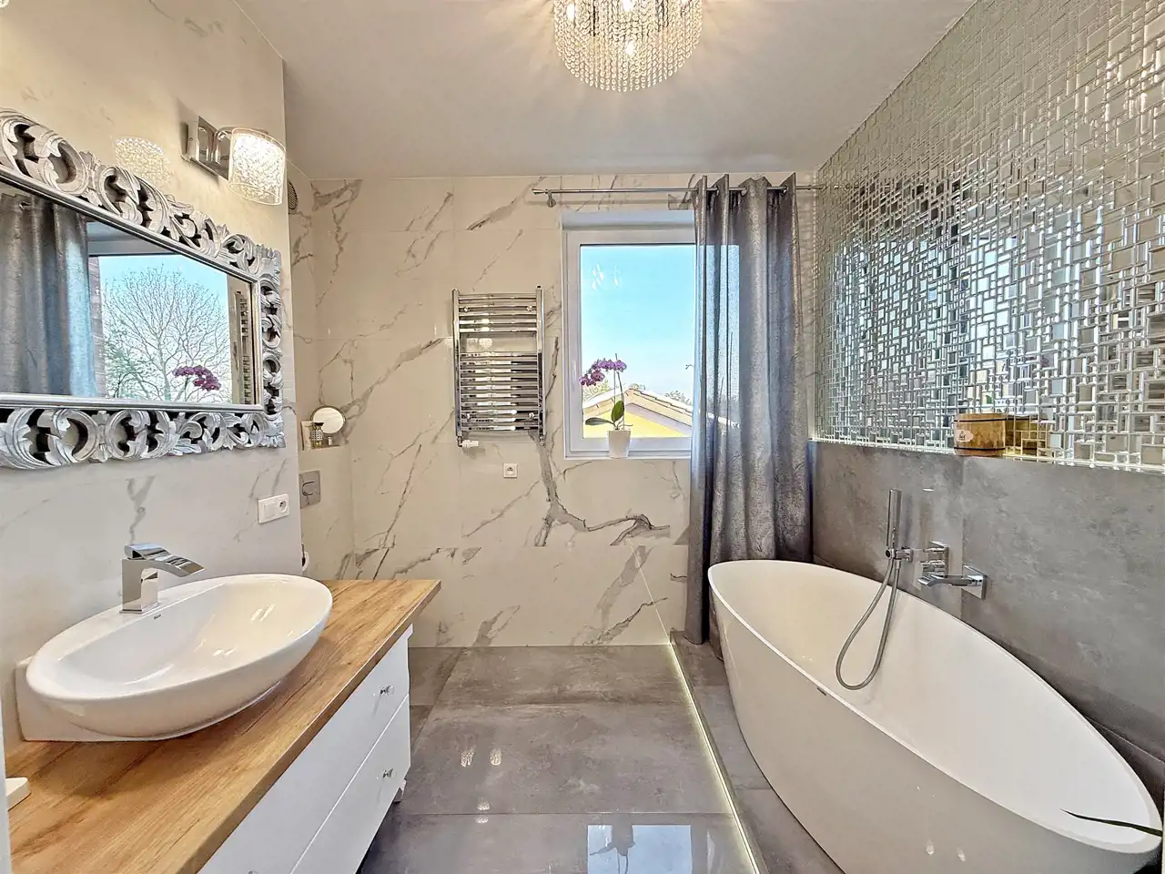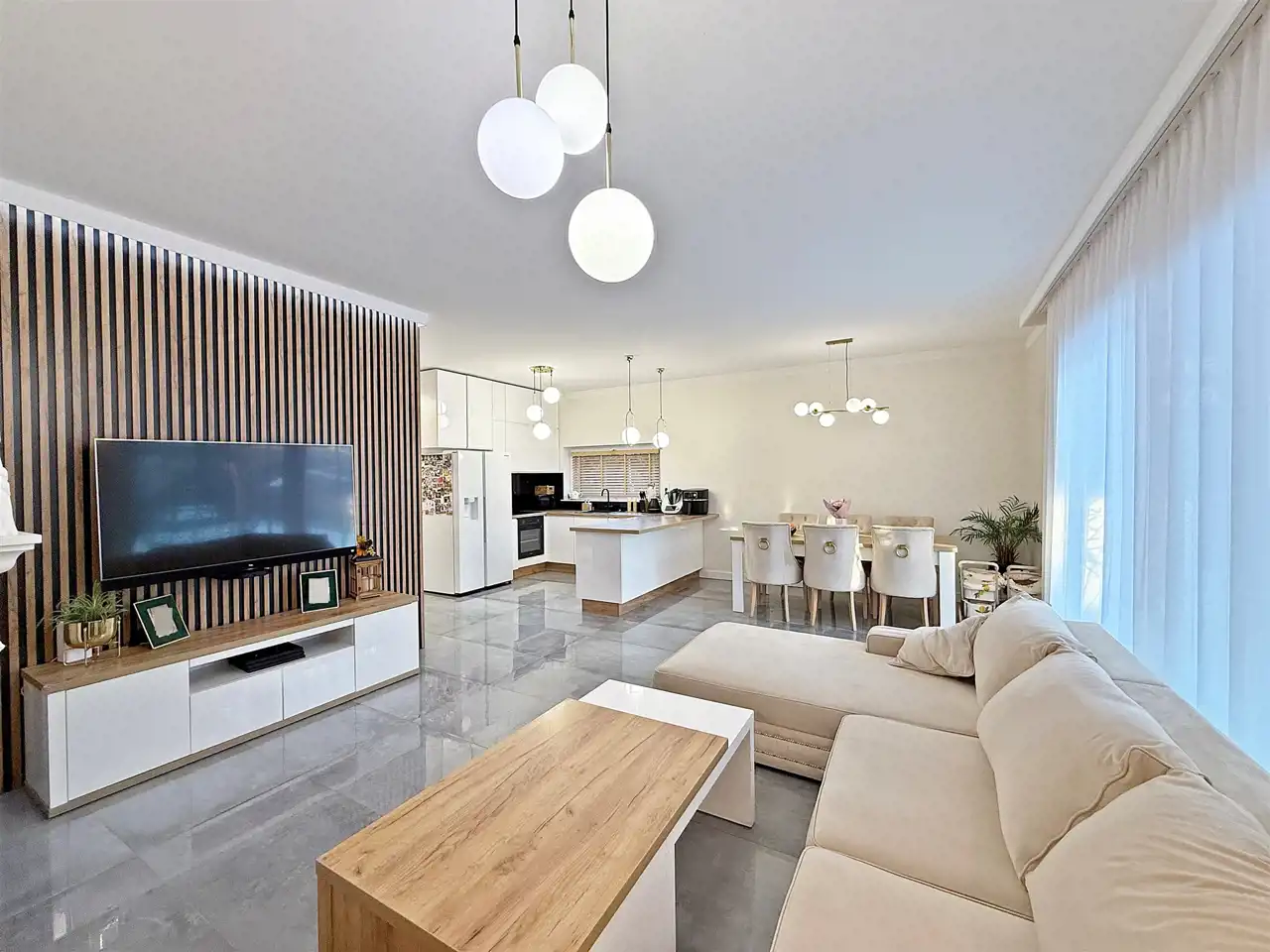 – eleganckie kafle w salonie, kuchni i łazienkach