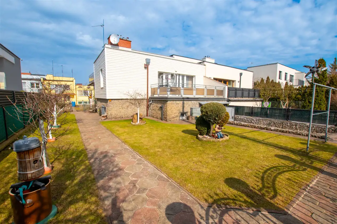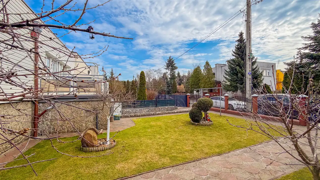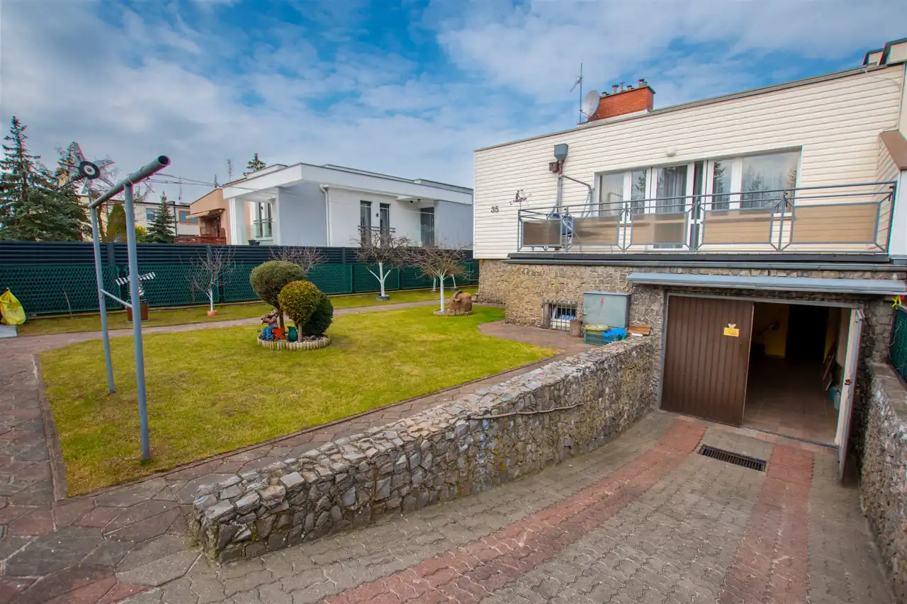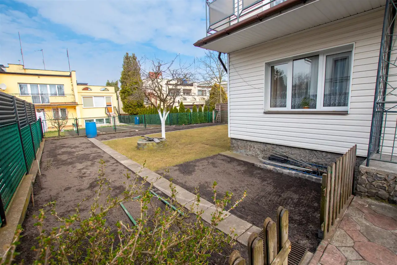 Działka o pow. 416 m2 jest całkowicie zagospodarowana i utrzymana w dobrej kondycji. Dodatkowo oprócz garażu istnieje możliwość parkowania auta za bramą na zjeździe do garażu. Od części frontowej domu działka w trawie z drzewami owocowymi (wiśnie oraz aronia), natomiast z tyłu działki częściowo trawa i gleba - możliwość urządzenia sobie tutaj własnego warzywniaka.