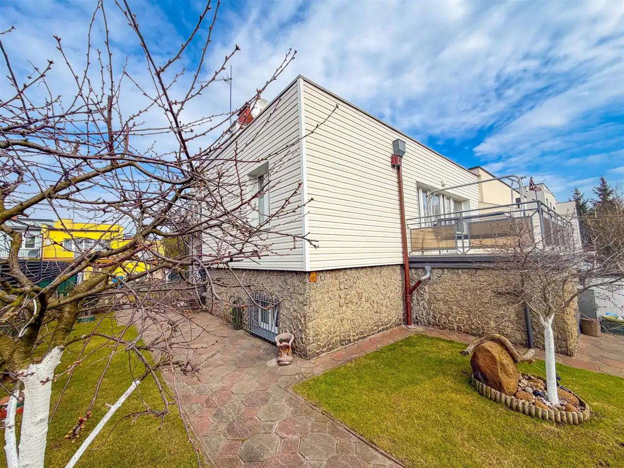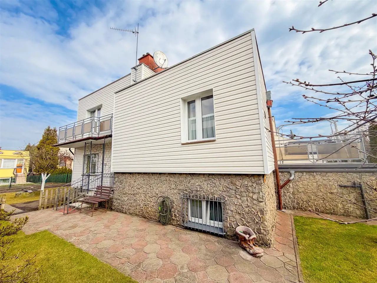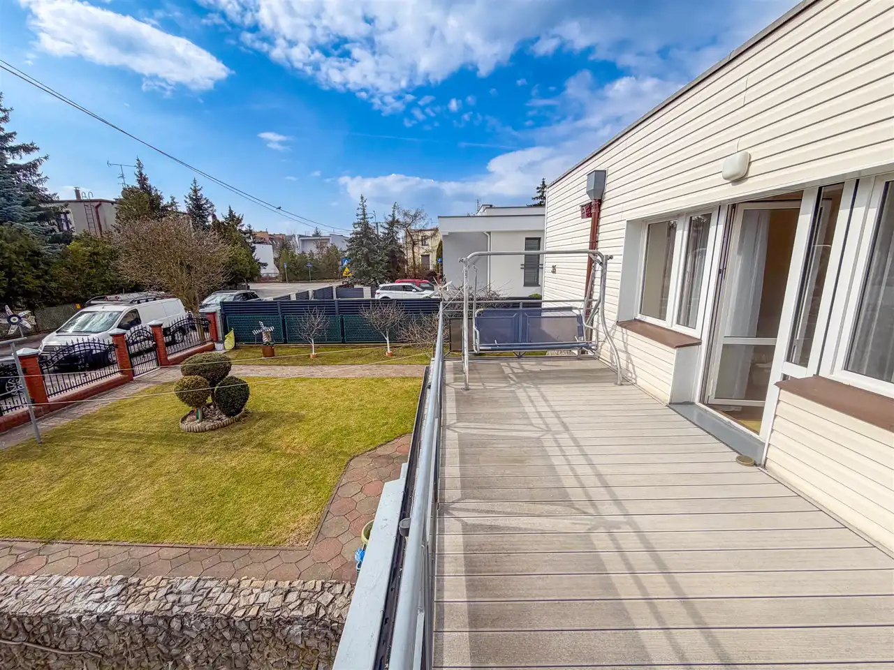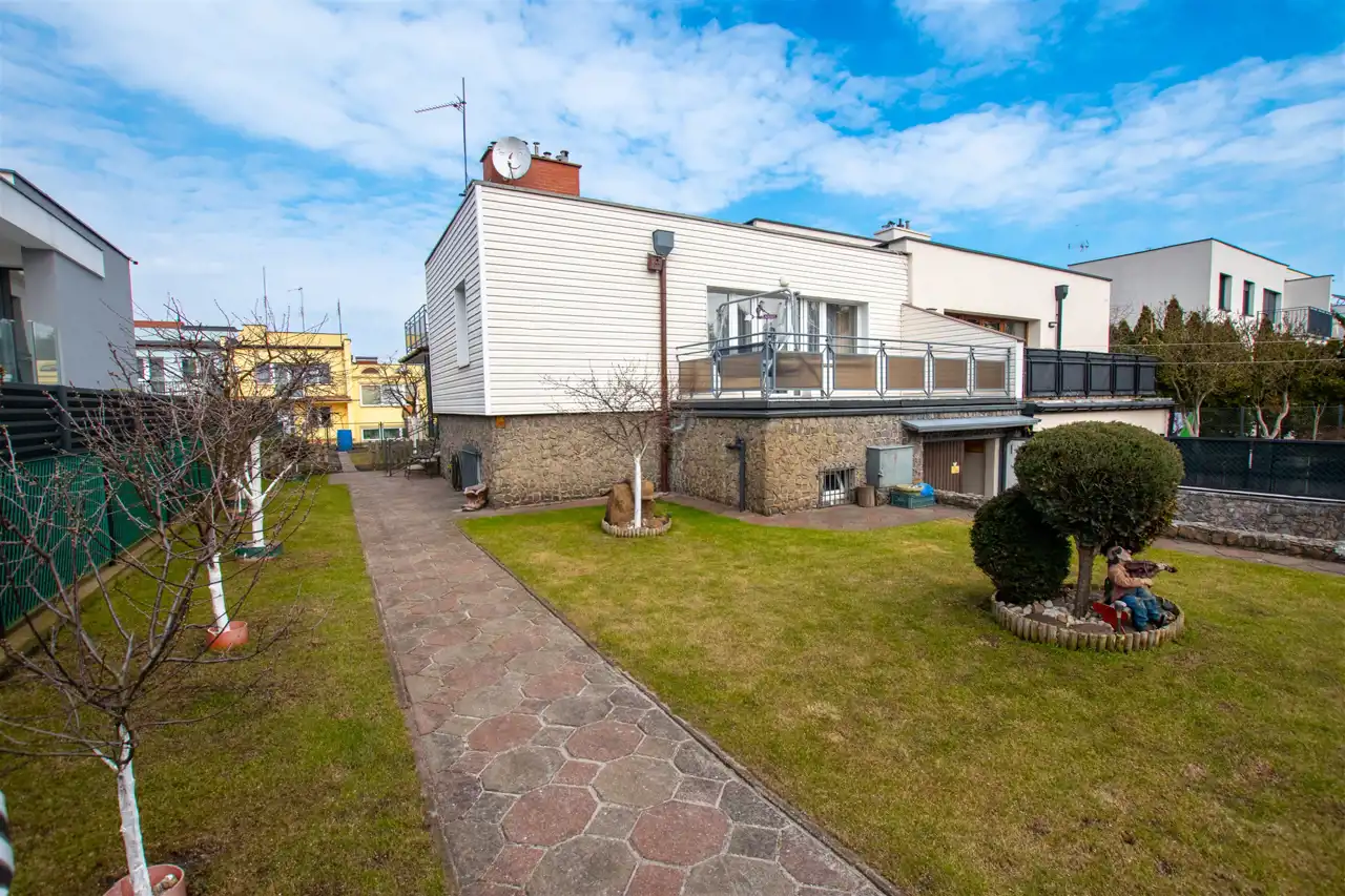 Działka o pow. 416 m2 jest całkowicie zagospodarowana i utrzymana w dobrej kondycji. Dodatkowo oprócz garażu istnieje możliwość parkowania auta za bramą na zjeździe do garażu. Od części frontowej domu działka w trawie z drzewami owocowymi (wiśnie oraz aronia), natomiast z tyłu działki częściowo trawa i gleba - możliwość urządzenia sobie tutaj własnego warzywniaka.