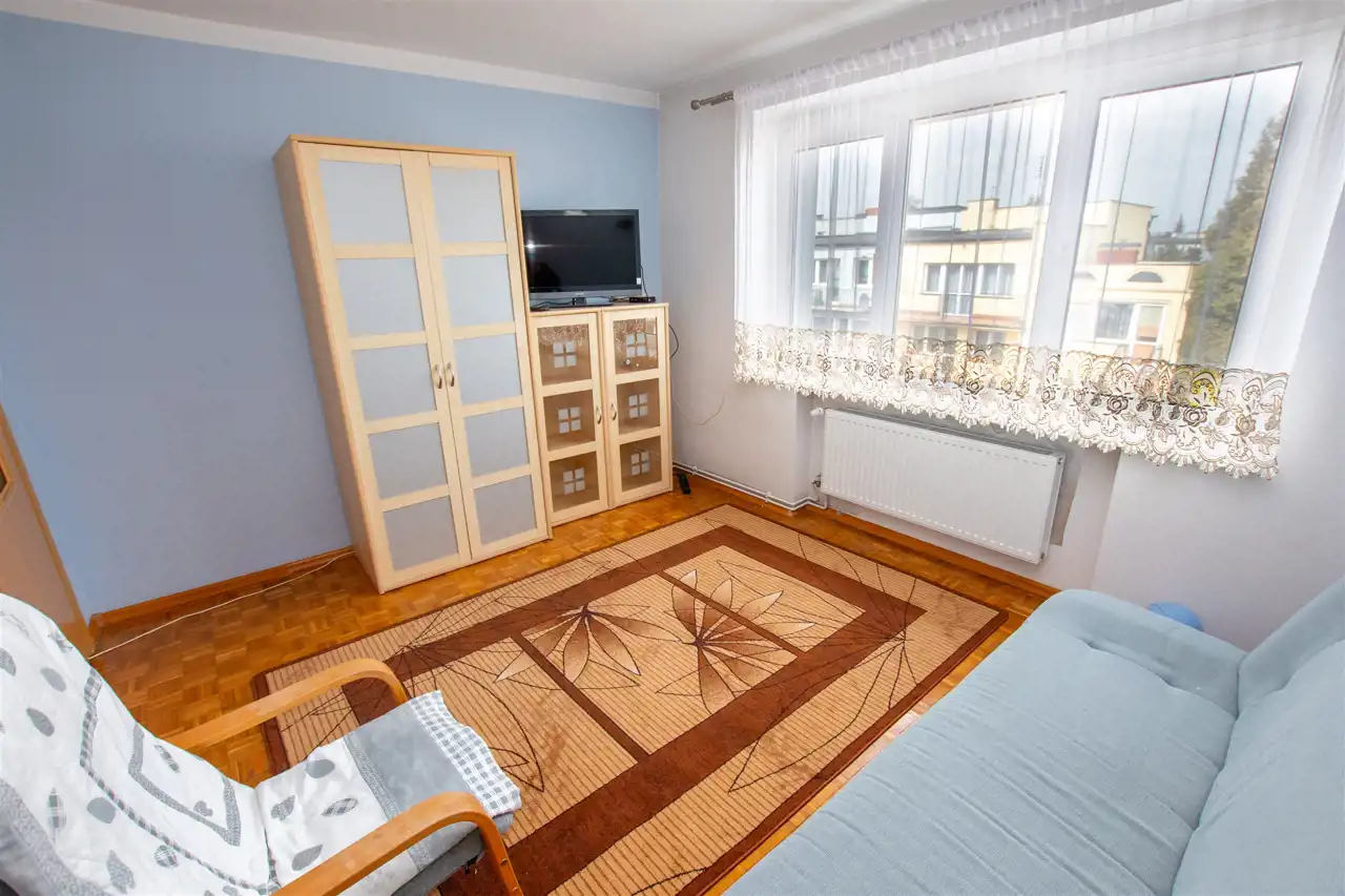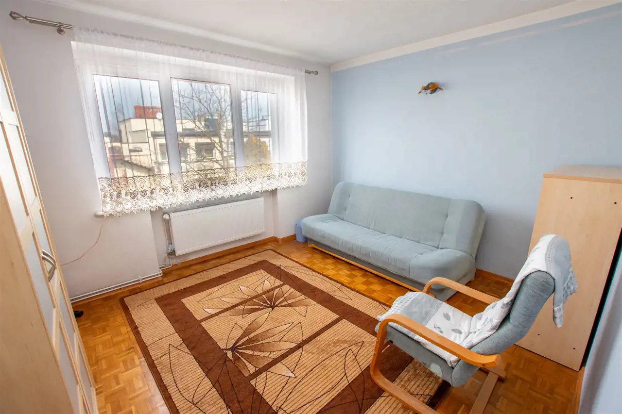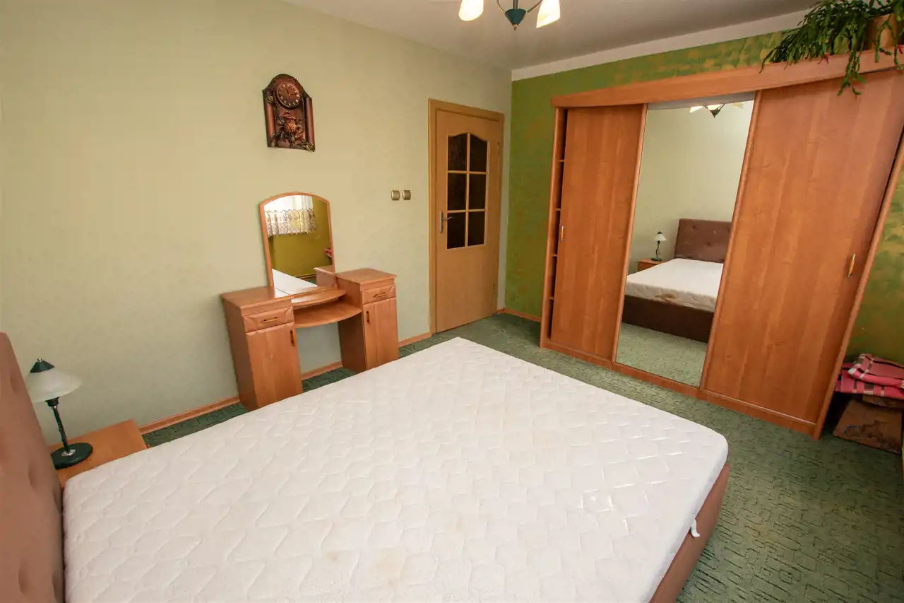 - dwa w pełni niezależne pokoje, jeden z nich 11,29 m2, drugi z nich 12,47 m2, w jednym z pokoi wyjście na balkon, ponadto w nim do dyspozycji zabudowa szafa oraz łóżko małżeńskie, drugi z pokoi bardzo ustawny, na podłogach mozaika parkietowa, na ścianach gładzie,
