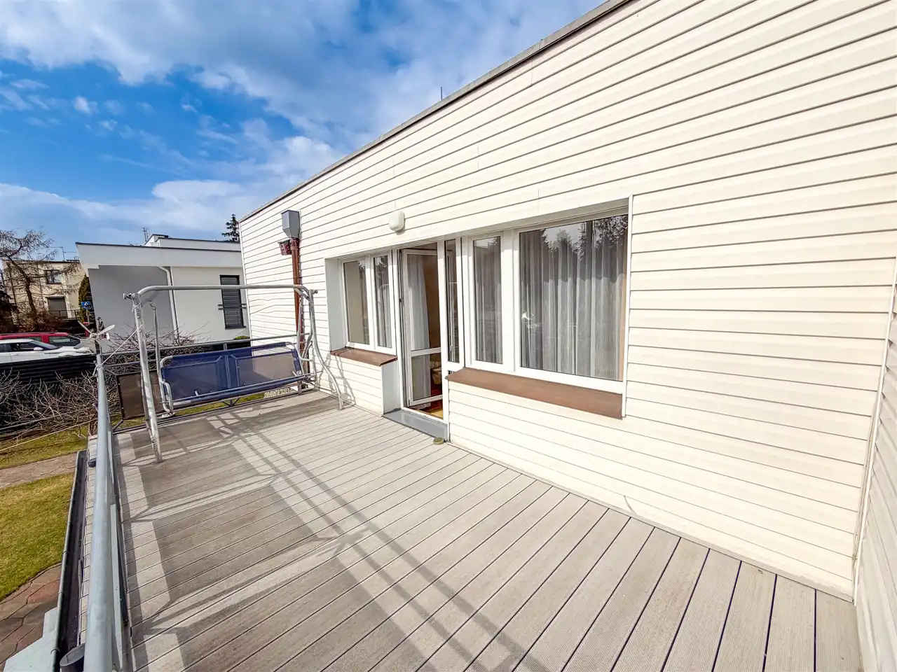 - po pokonaniu kilku 4-5 schodków wejście do salonu o metrażu około 25 m2, z którego mamy wyjście na przestronny taras wyłożony deską kompozytową, ściany salonu wykończone gładziami gipsowymi, natomiast podłoga w panelach podłogowych,