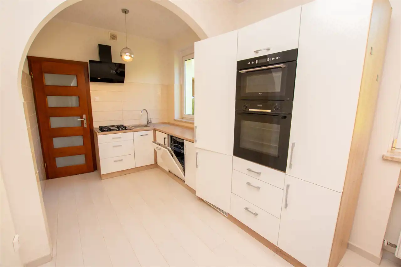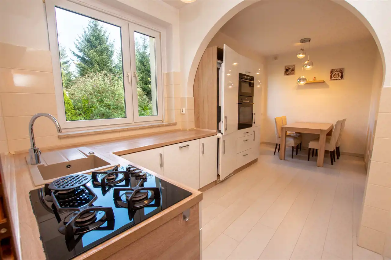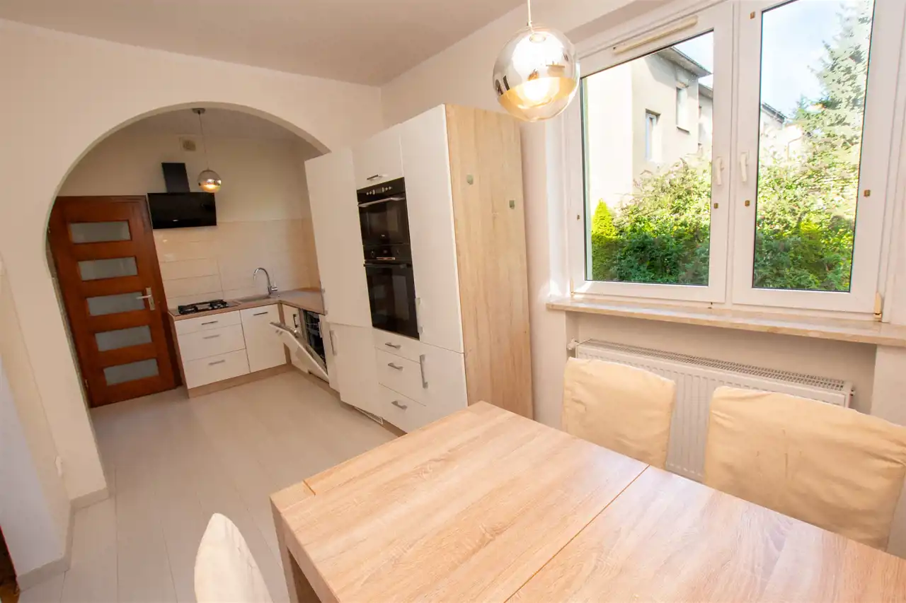 - kuchnię połączoną z jadalnią - do dyspozycji zabudowa kuchenna wraz ze sprzętami agd (zmywarka, lodówka z zamrażarką, mikfroala i piekarnik w zabudowie), stół z krzesłami,