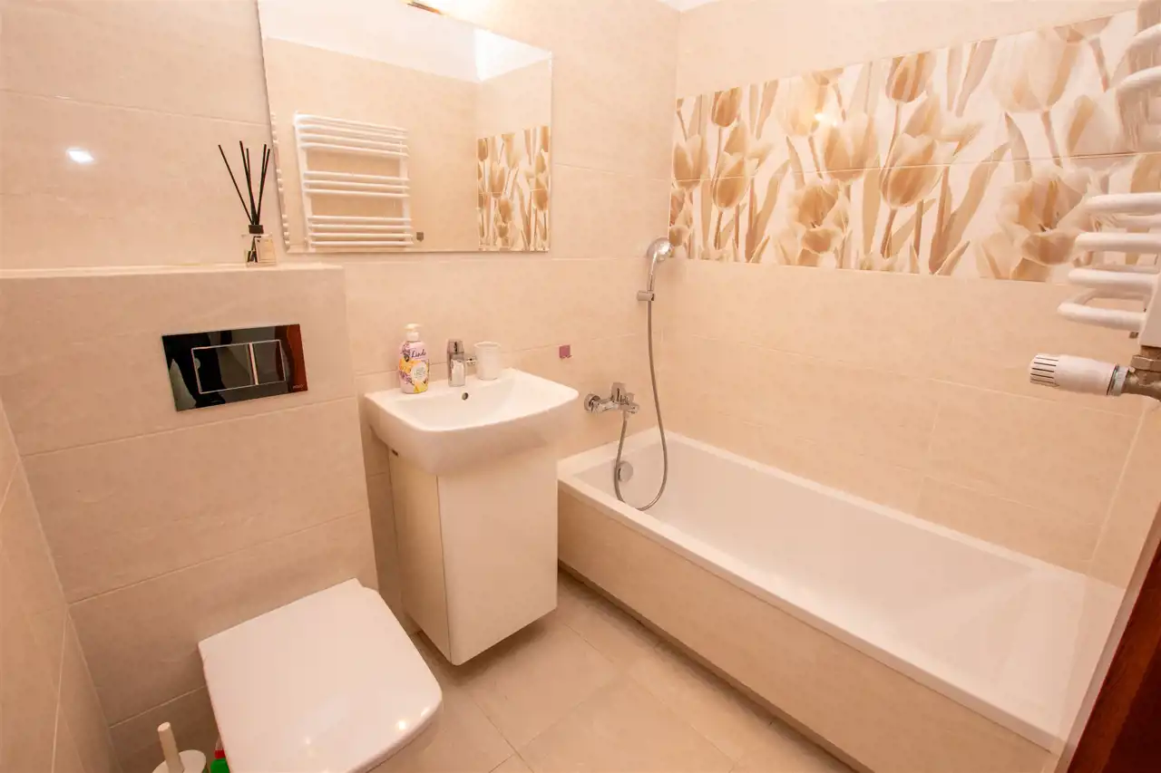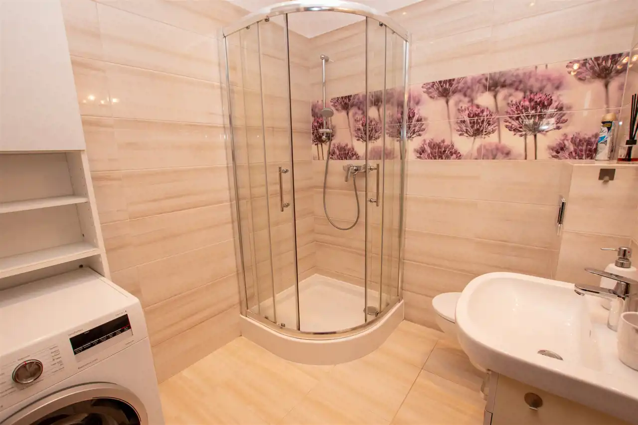 - duża łazienka - z pralką, dla fanów szybkich kąpieli - kabiną prysznicową, umywalką i wc.