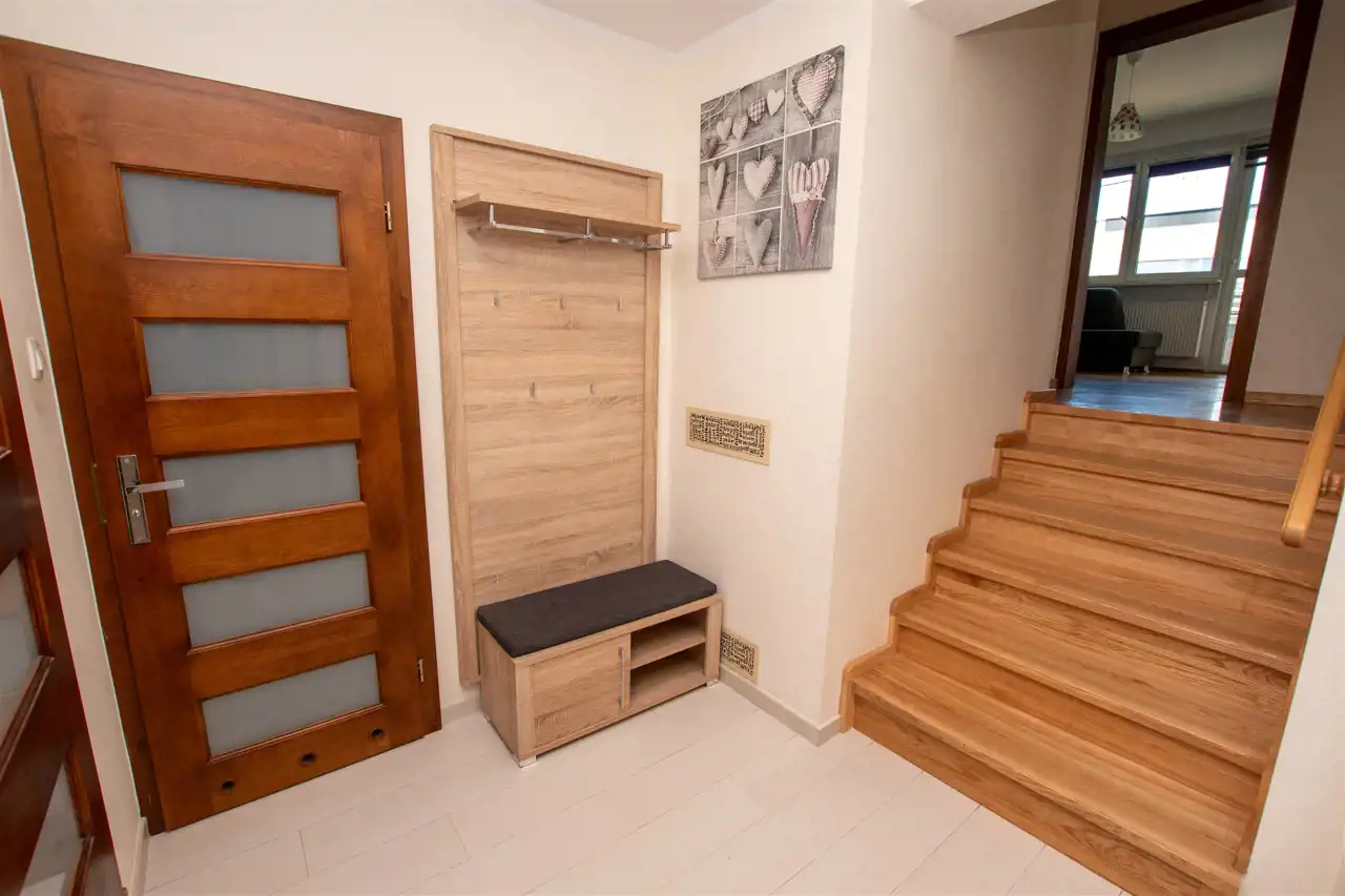 - przedpokój - tutaj znajduje się m.in. szafka z wieszakami, na podłodze terakota, na ścianach gładzie.